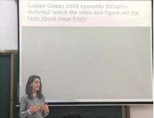 Ani老师的教学设计遵循“概念理解(恐惧)→(恐惧)症状→(恐惧)原因→解决方案→实践应用”的清晰逻辑链,确保教学内容层层递进、连贯性强。教学以“公众演讲的文化影响”为切入点,引导学生结合中国文化背景反思自身的恐惧心理,激发学生的共情与课堂活动参与热情。随后,通过分析莱昂纳多・迪卡普里奥在2005年金球奖演讲中的紧张表现及应对技巧,将理论概念与真实场景紧密结合。这一视频案例的引入不仅使抽象理论具象化,更大幅提升了课堂的趣味性与代入感。