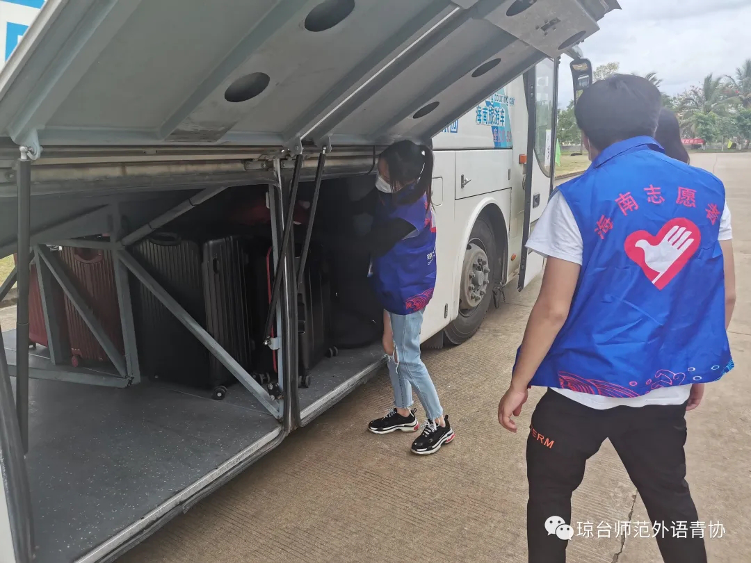 志愿者帮助同学拿行李,带领同学乘坐校车