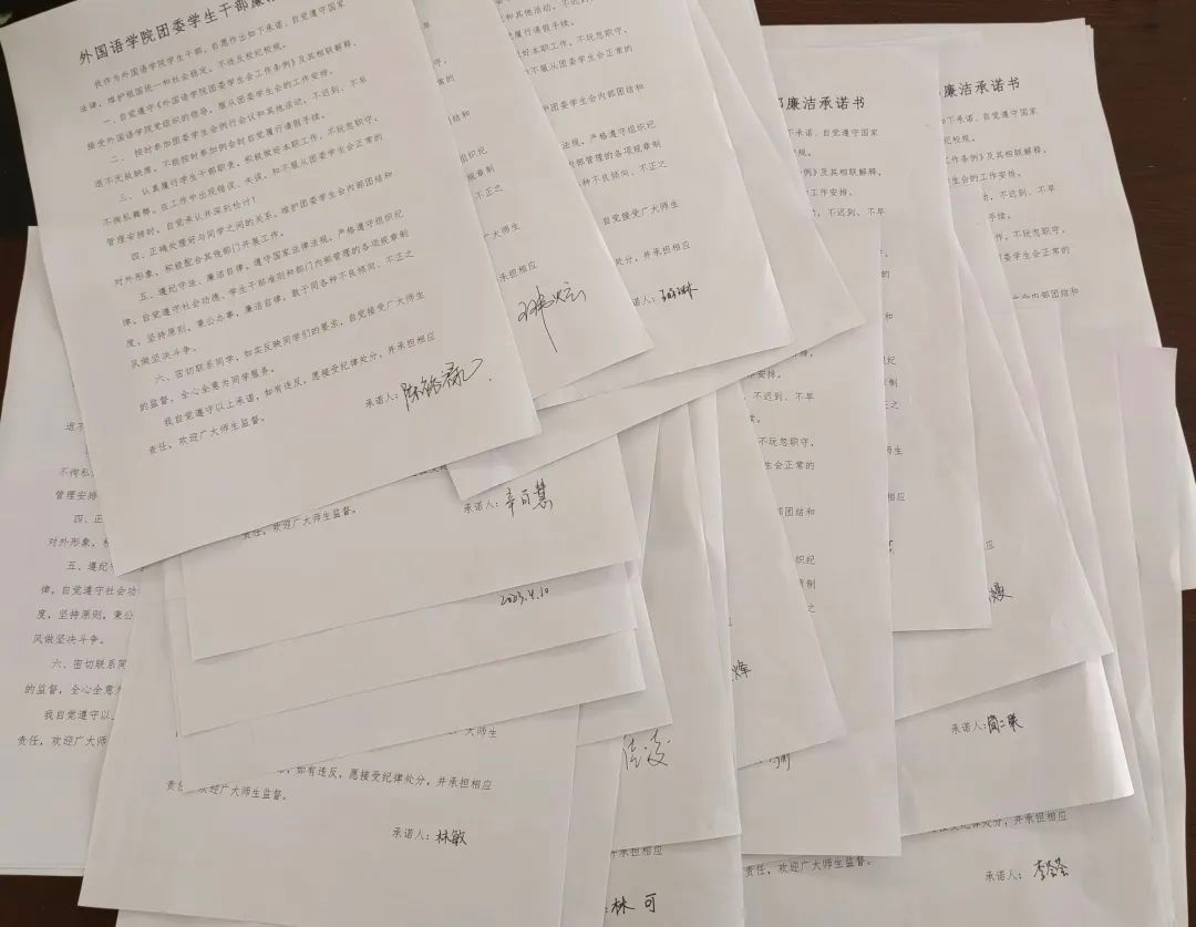 我作为外国语学院学生干部,自愿作出如下承诺、自觉遵守国家法律,维护祖国统一和社会稳定。不违反校纪校规。