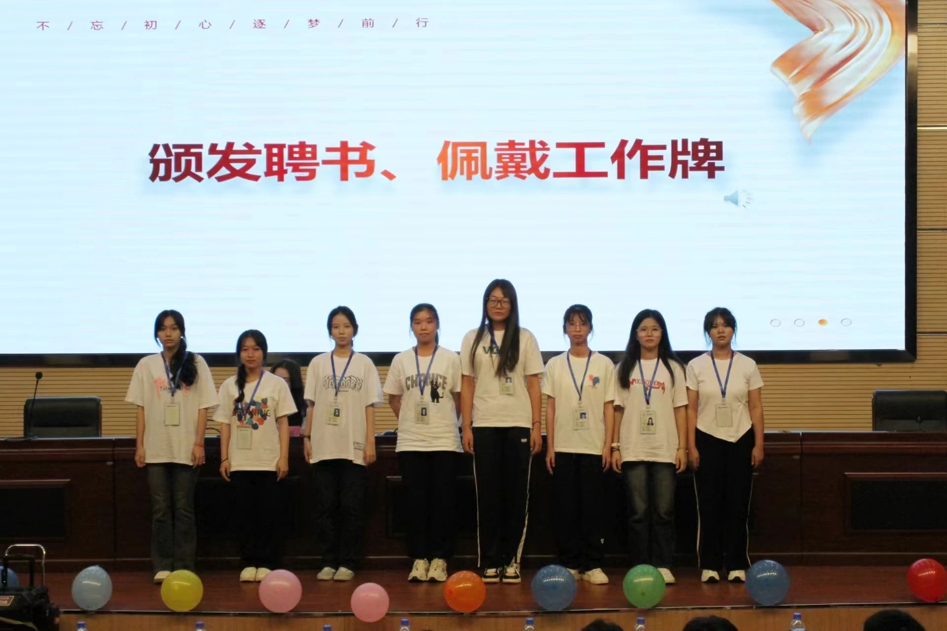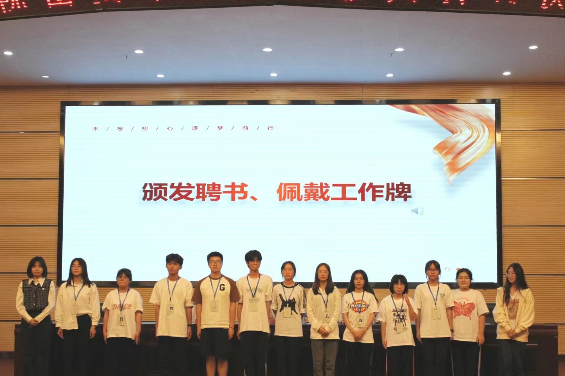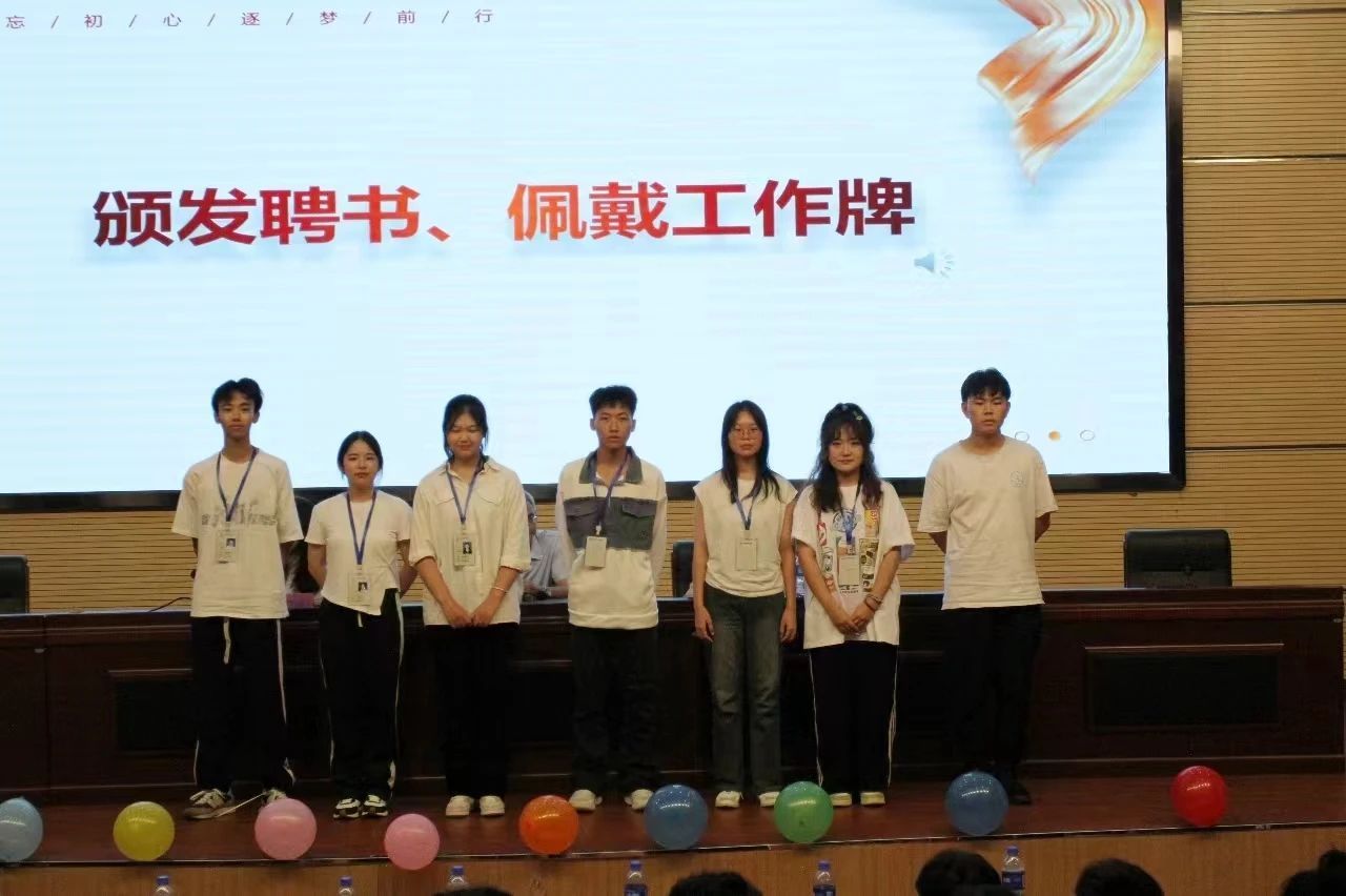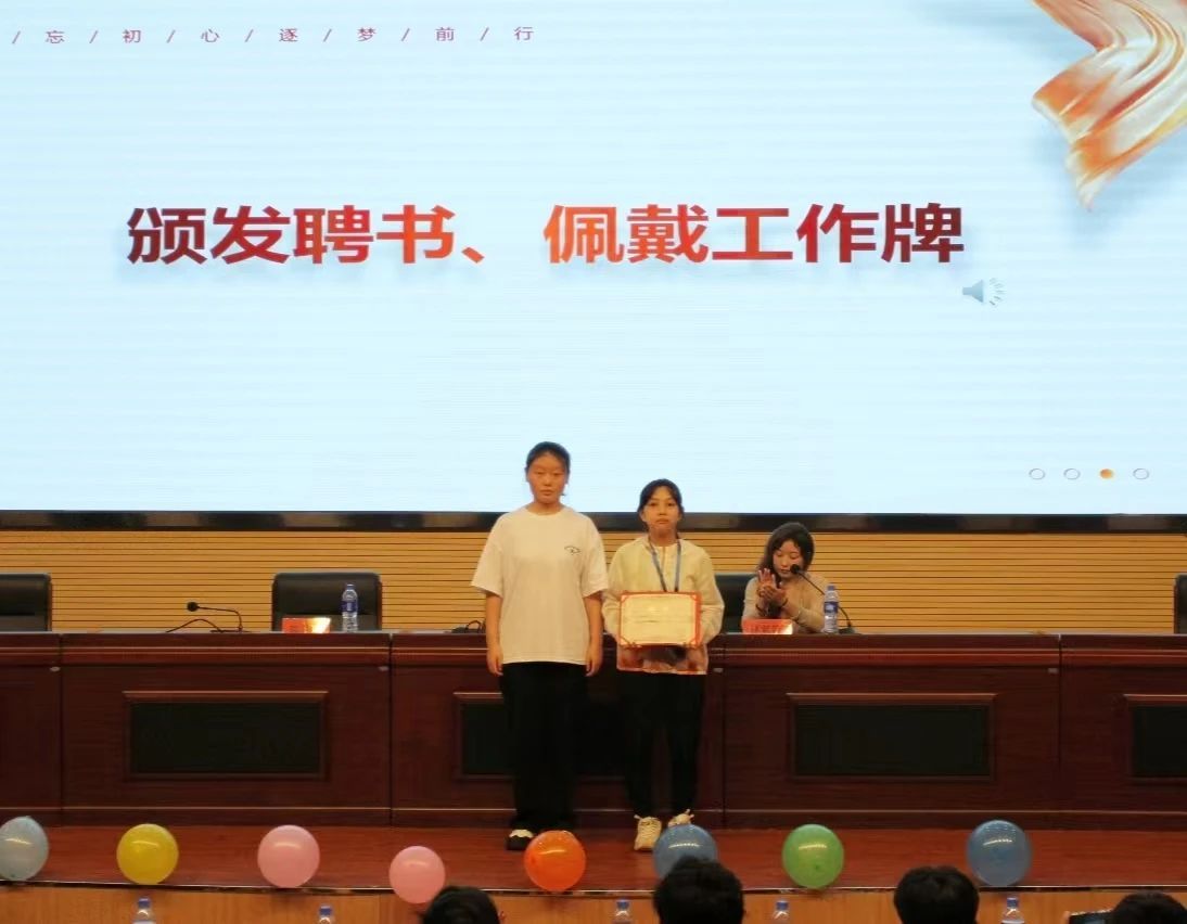 各部门部长为新任干事佩戴工作牌。