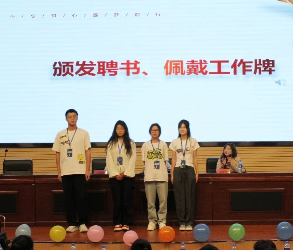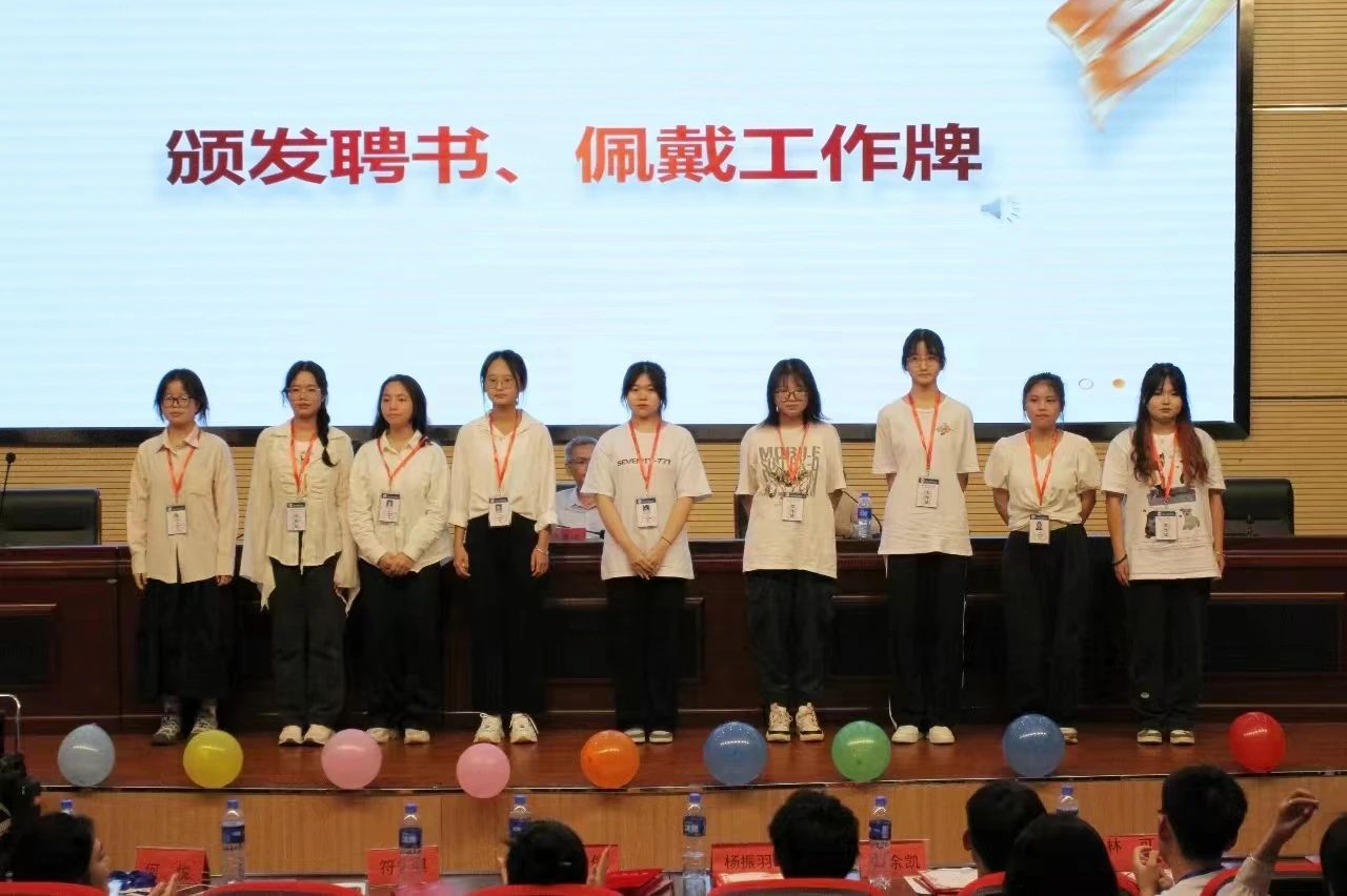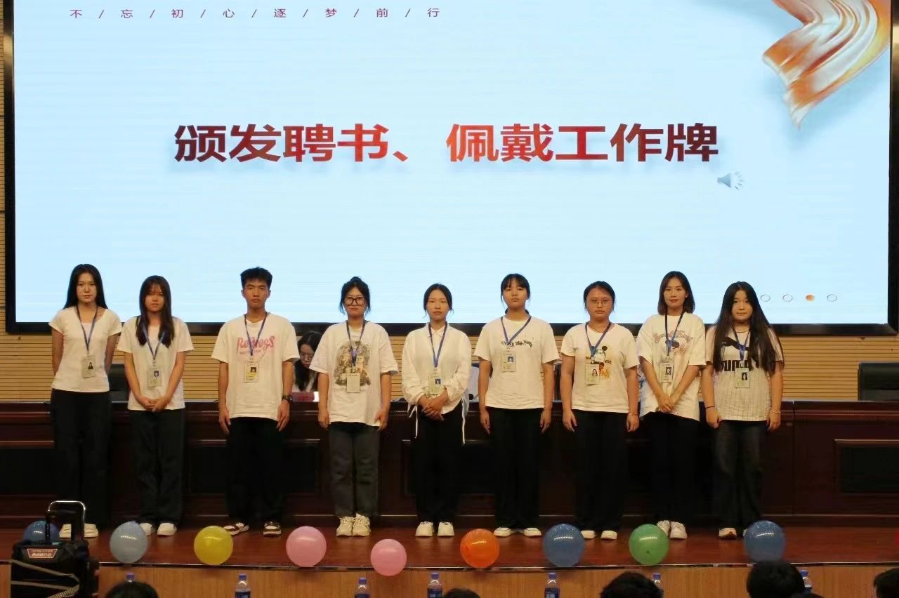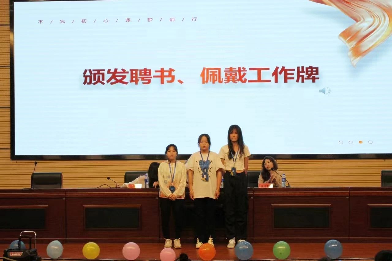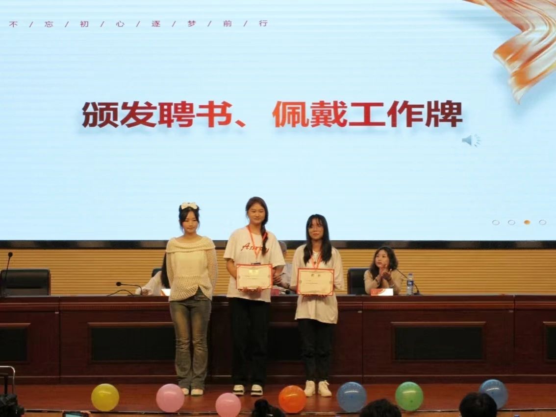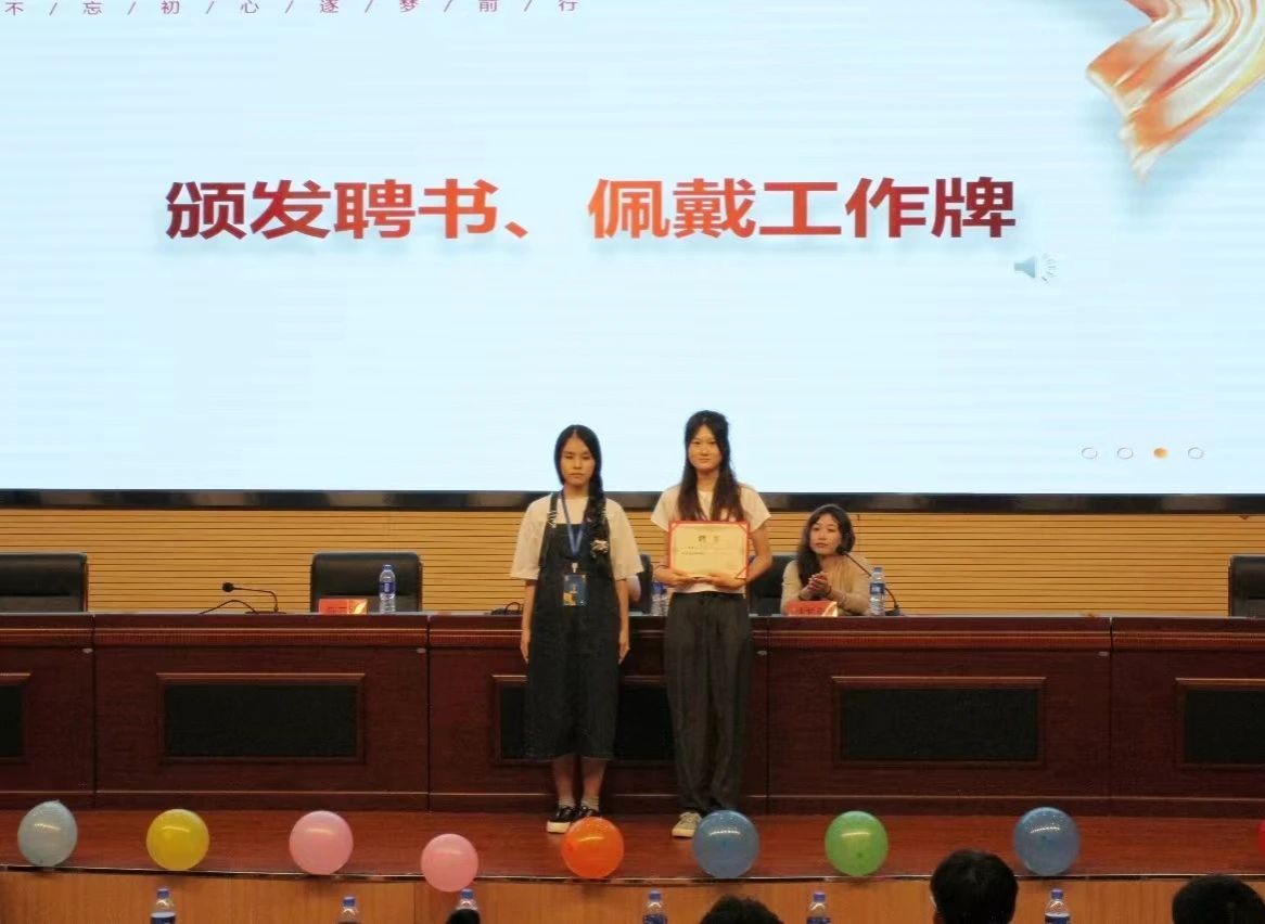 第三届团委书记林紫荆,辅导员陈芯妍为新一届团委学生会主席团,青年志愿者协会理事会、易班发展中心主任团和外国语主持队主任颁发聘书。