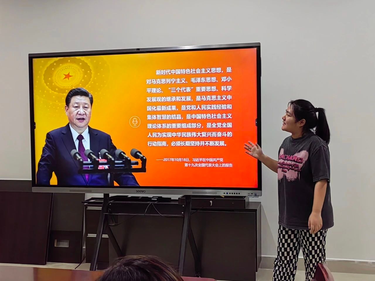 首先何悦同学同大家一起学习了习近平新时代中国特色社会主义思想是立足时代之际、回答时代之问的科学理论。伟大的时代呼唤伟大理论,伟大的时代孕育伟大理论。青年处在这伟大的时代,也定当立足当下,争做新时代青年。