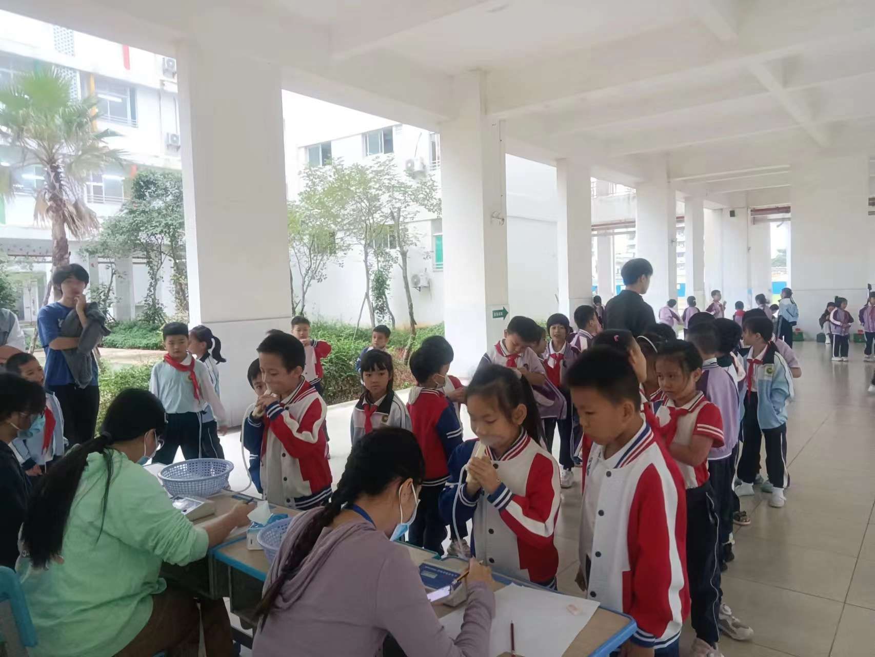 学生排好队伍,实习老师们按部就班,并且耐心细致地指导学生们进行肺活量测试。