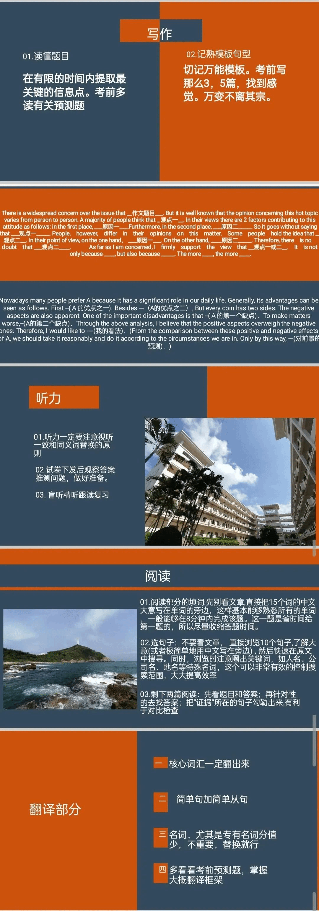 1、读懂写作题目,记熟模板句型,考前写3~5篇的写作题,找到手感,有助考场发挥。