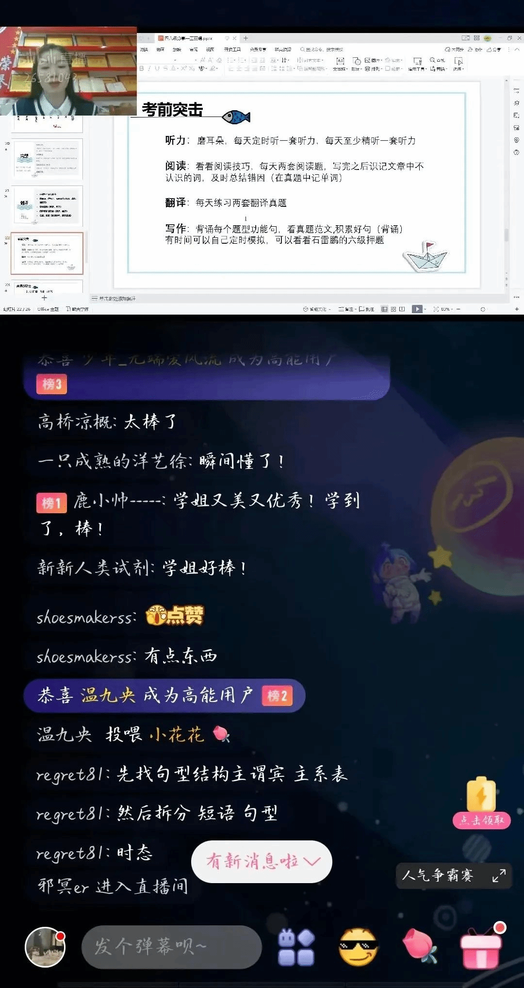 两位分享者分别从听力,阅读,写作,翻译这四大类考题一一解读。