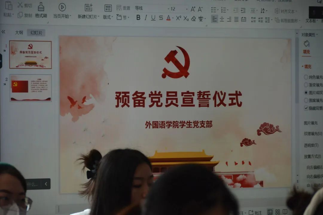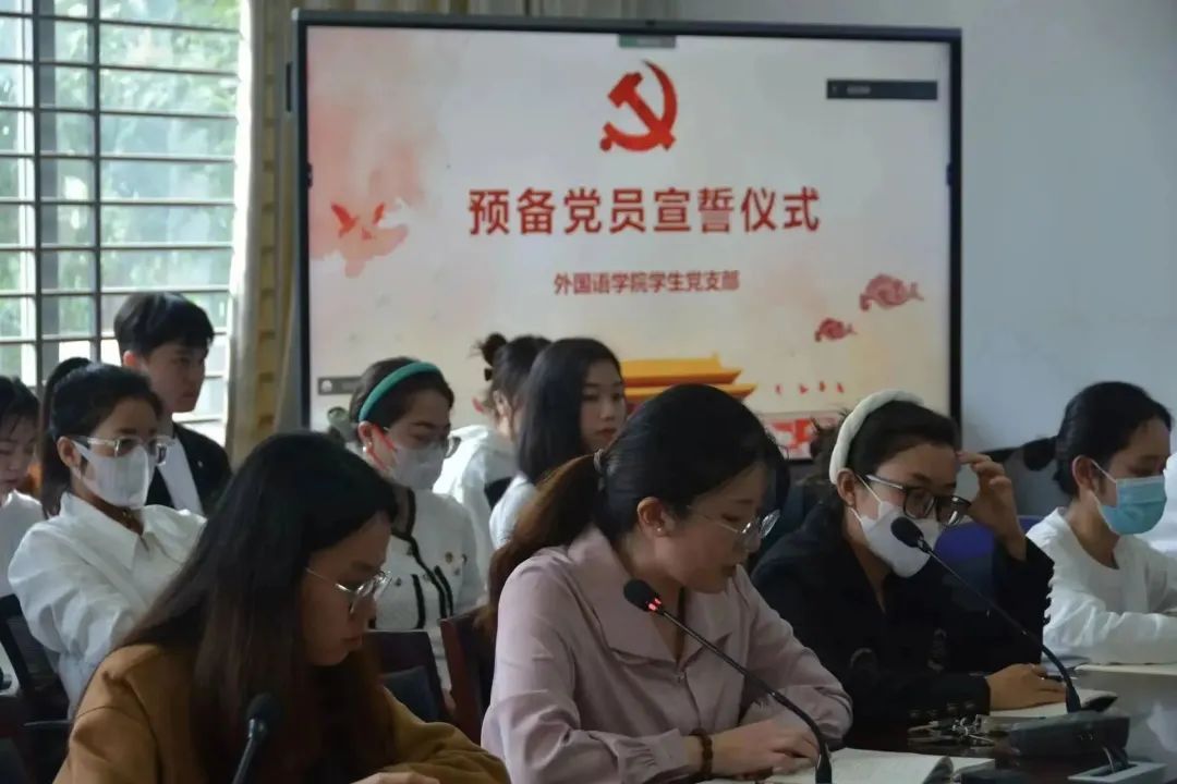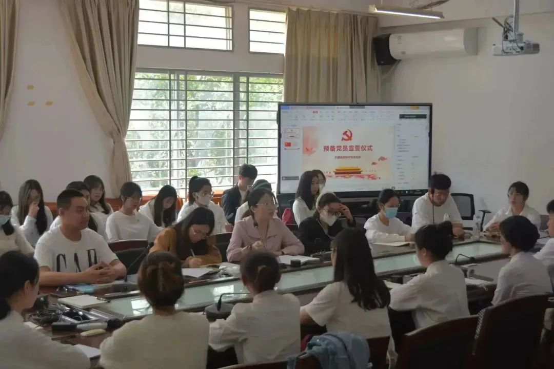 2023年2月23日中午,外国语学院党总支学生党支部在文B205召开2022年预备党员入党宣誓仪式。出席本次会议的有学生党支部书记祁文婧同志、学生党支部支委委员陈芯妍同志和林紫荆同志以及学生正式党员和预备党员。本次大会由学生党支部书记祁文婧同志主持。
