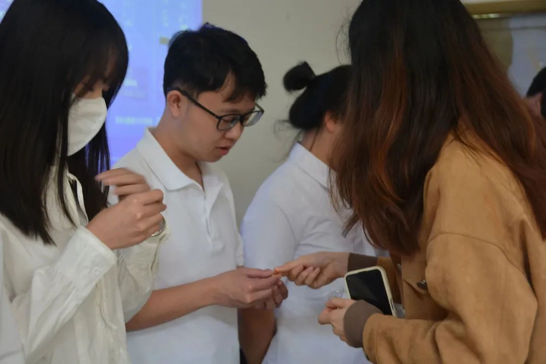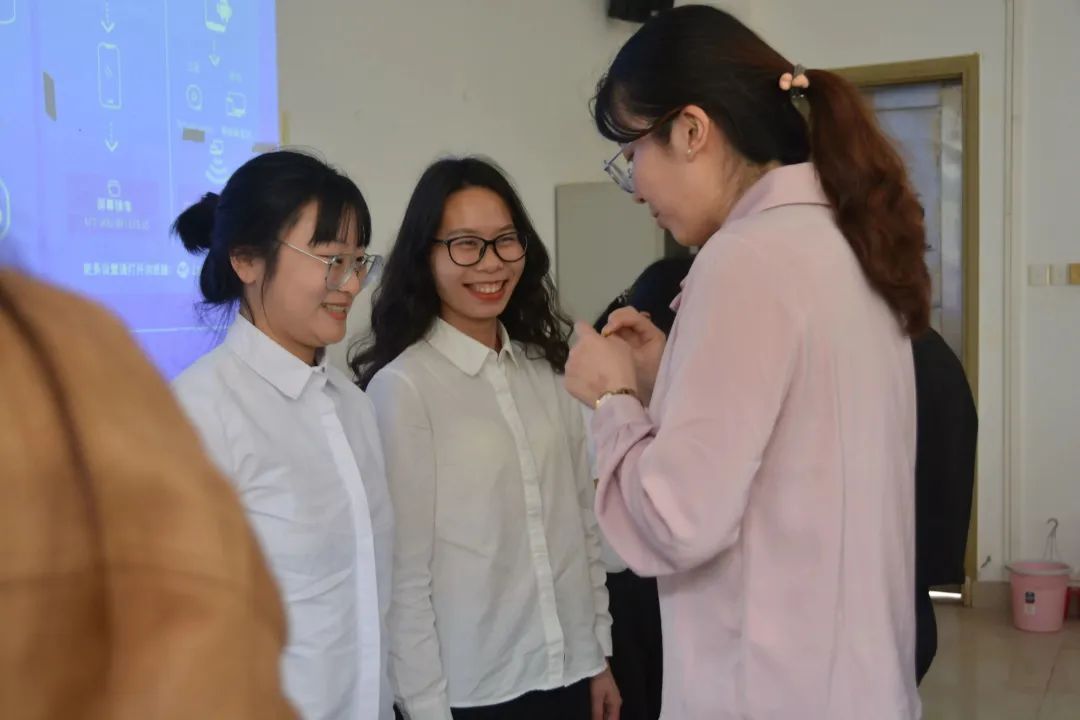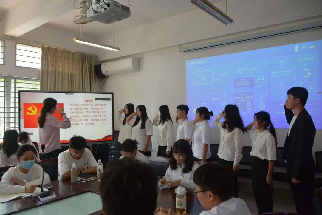 学院党支部书记祁文婧同志、学院党支部支委委员陈芯妍同志和林紫荆同志为八位预备党员佩戴党员徽章。由党支部书记祁文婧同志领读入党誓词,带领八位预备党员进行入党宣誓。