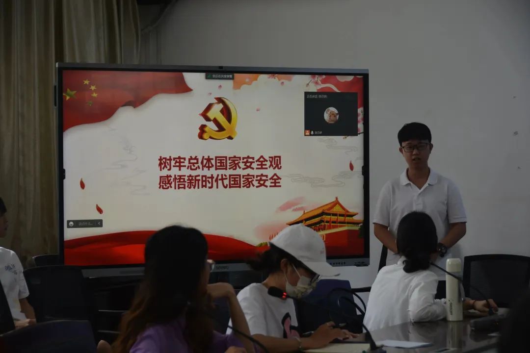 学生党支部支委委员陈芯妍同志宣读本次全民国家安全教育日宣传教育活动的活动主题、活动目的、活动时间、活动安排以及工作要求。此次国家安全教育日的活动主题是:贯彻总体国家安全观,增强全民国家安全意识和素质,夯实以新安全格局保障新发展格局的社会基础。支委委员陈芯妍介绍了《习近平关于总体国家安全观论述摘编》《习近平关于防范风险挑战、应对突发事件论述摘编》的重点内容和意义,要求学生党员加强学习,增强国家安全意识和素养。