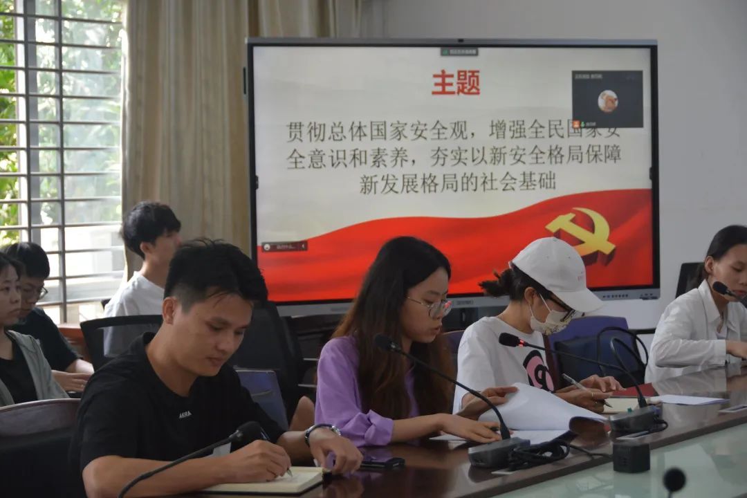 在第八个全民国家安全教育日来临之际,为深入学习党的二十大精神、贯彻习近平总书记关于国家安全观的重要论述精神,我院学生党支部于2023年4月13日中午12点,在文B205党员活动室召开了2023年全民国家安全教育日专题学习活动。参与本次学习活动的有学生党支部组织委员兼宣传委员陈学老师,学生党支部支委委员陈芯妍老师、林紫荆老师,学生正式党员和预备党员。本次会议由陈芯妍老师主持。