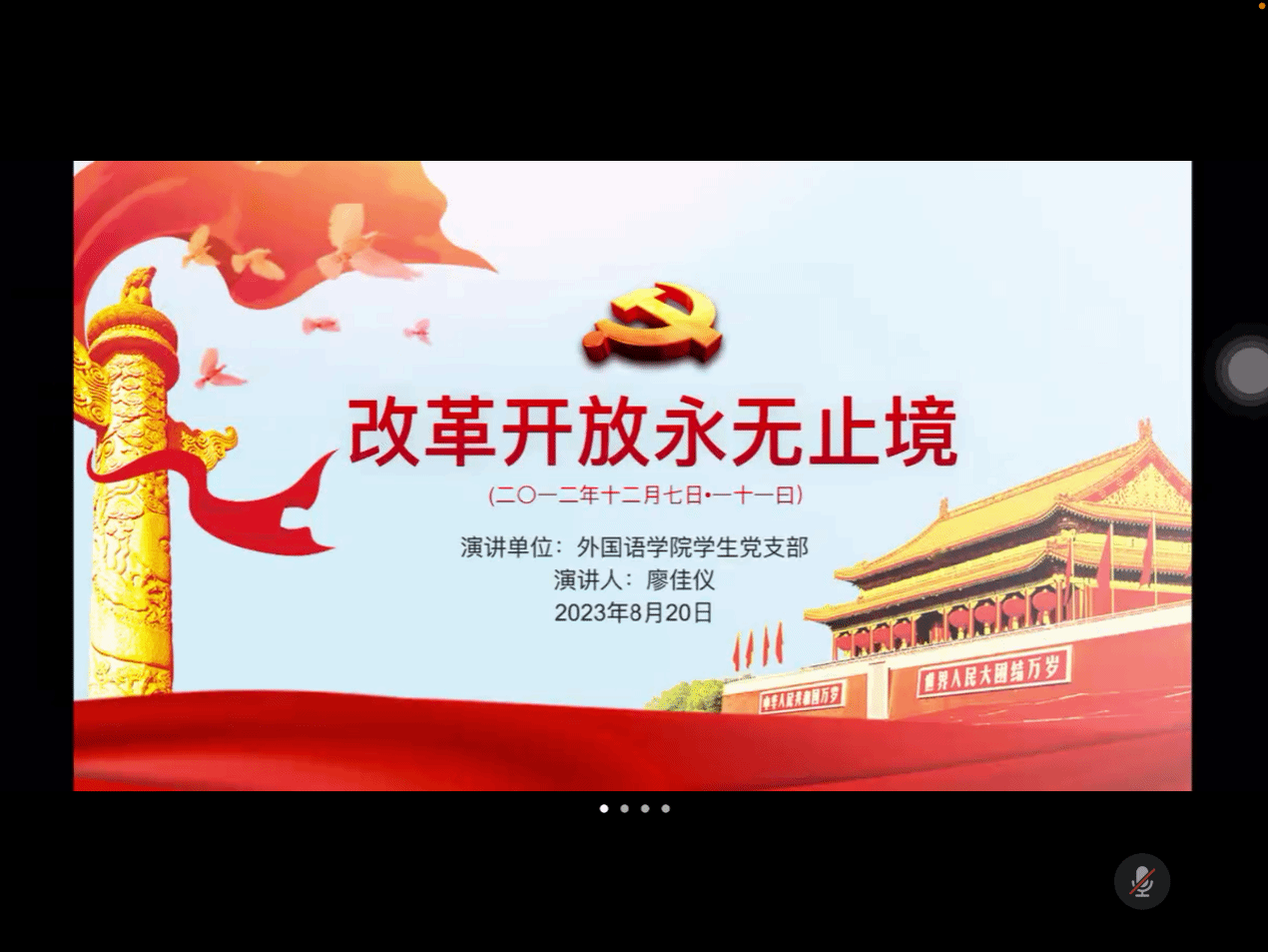 廖佳仪同志从坚定信心、凝聚共识、统筹谋划、协同推进四个方面介绍改革开放永无止境,向我们传达了改革开放是决定当代中国命运的关键一招,面对改革过程中的矛盾和困难,要坚定正确方向,敢于啃硬骨头,敢于涉险滩,坚定不移推进改革开放。