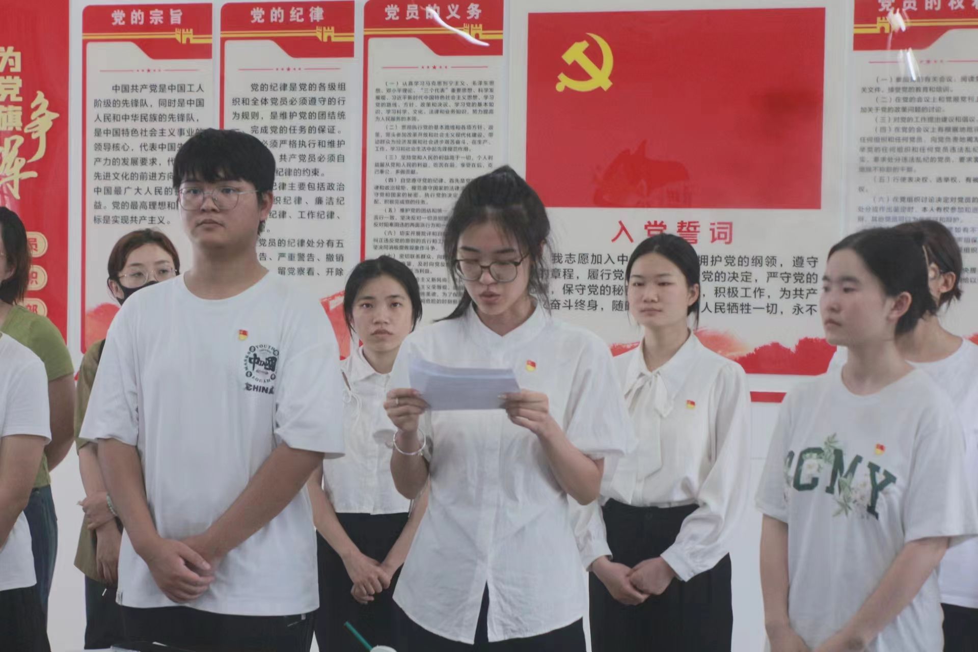 外国语学院党委书记袁昌清同志带领钟婉玲、王梧帆、吴英铸、刘峻启、吴鑫、段婧雯、孔维娅、刘子怡、康静、吴恺倩这十位中共预备党员宣读入党誓词,进行入党宣誓。