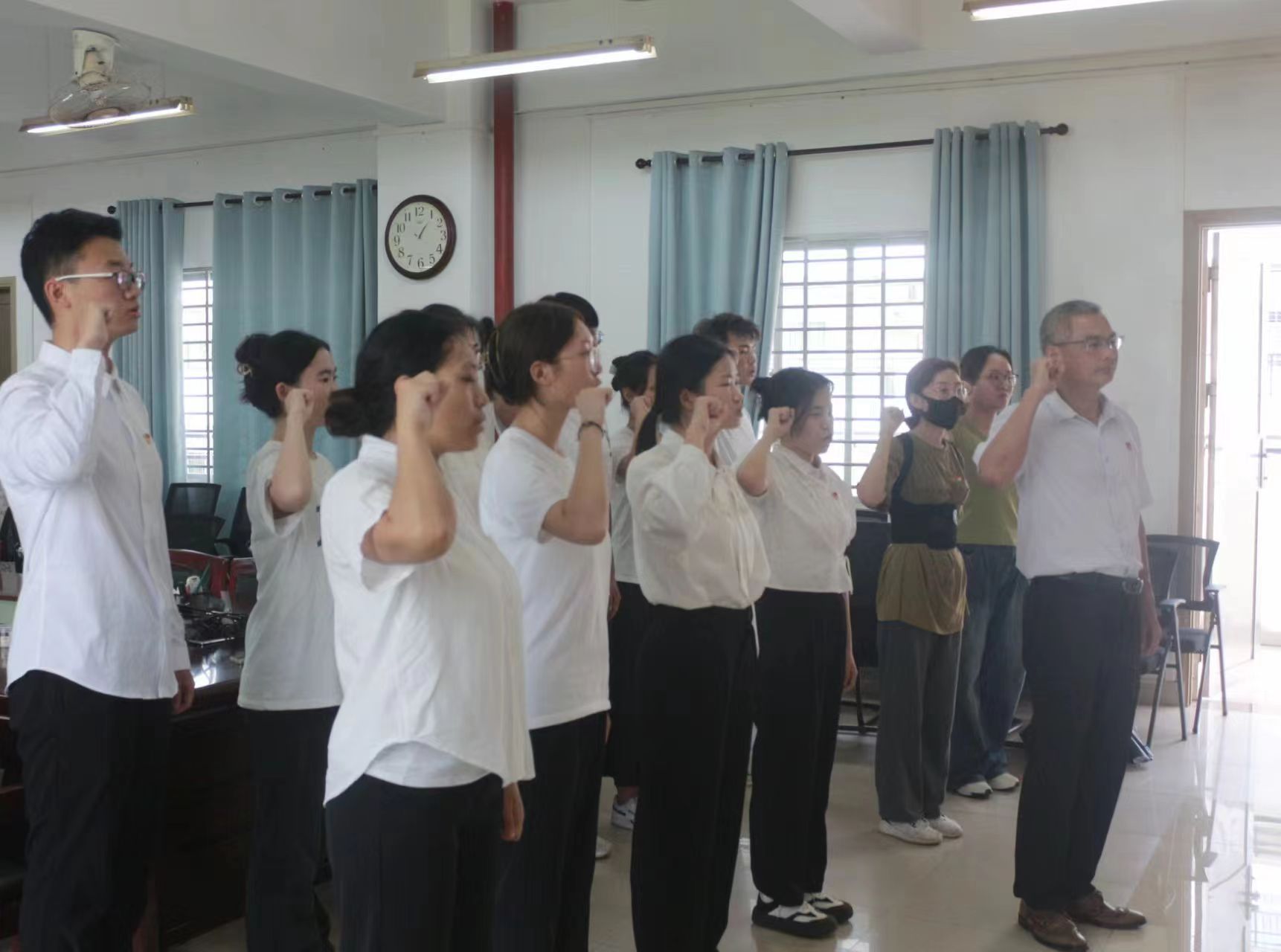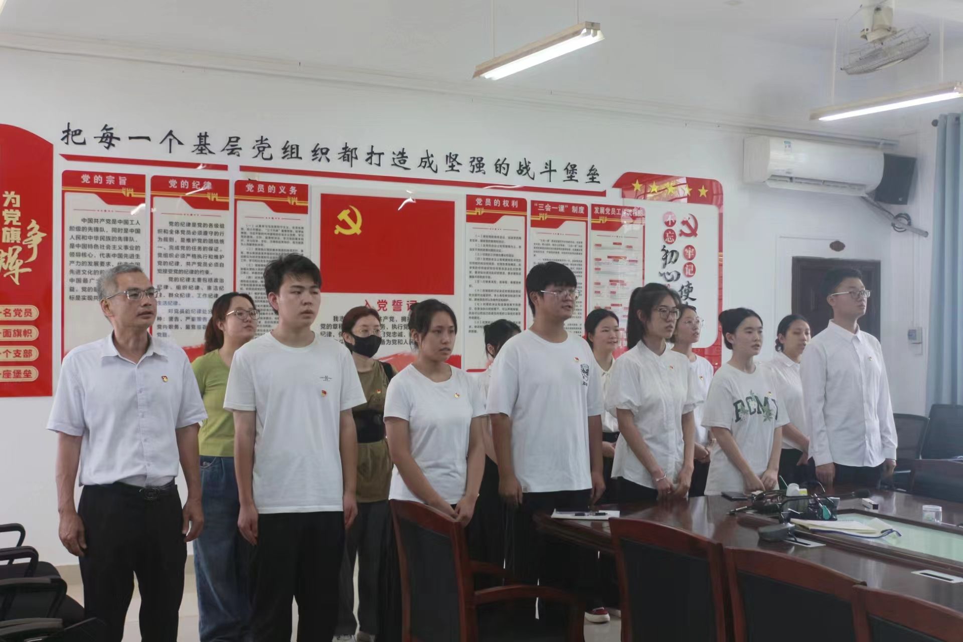 外国语学院学生党支部于7月1日下午一点在文B205举办预备党员入党宣誓仪式。参与本次仪式的有外国语学院党委书记袁昌清同志、党支部书记陈芯妍同志、支委委员林紫荆同志、彭鑫慧同志以及学生预备党员。本次大会由学生党支部书记陈芯妍同志主持。