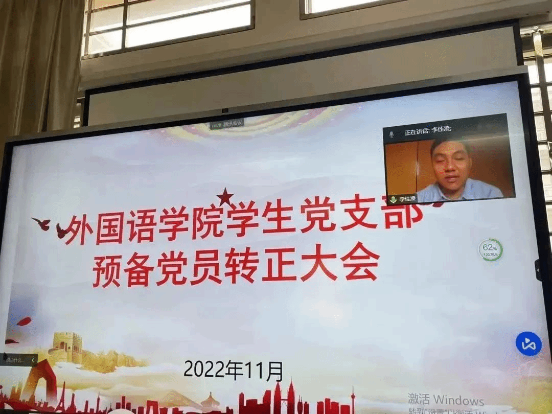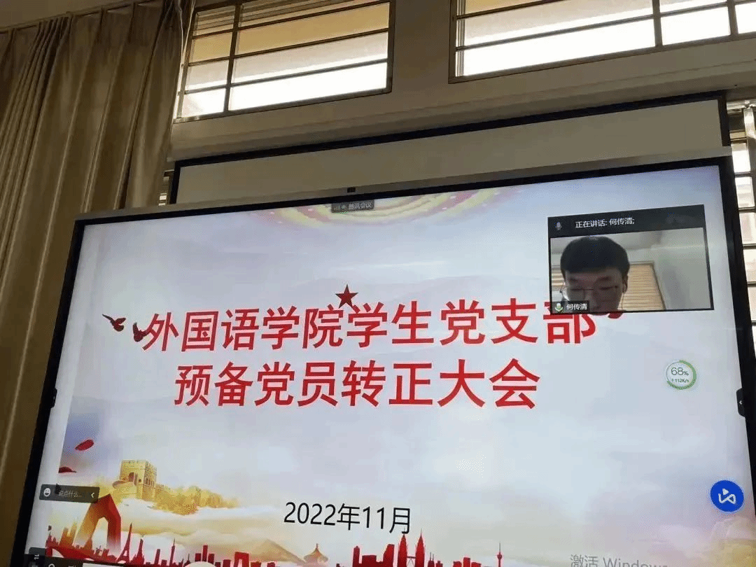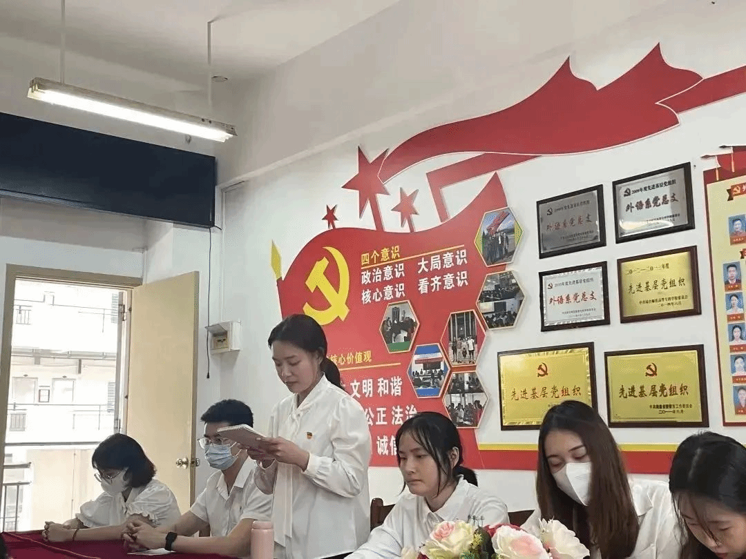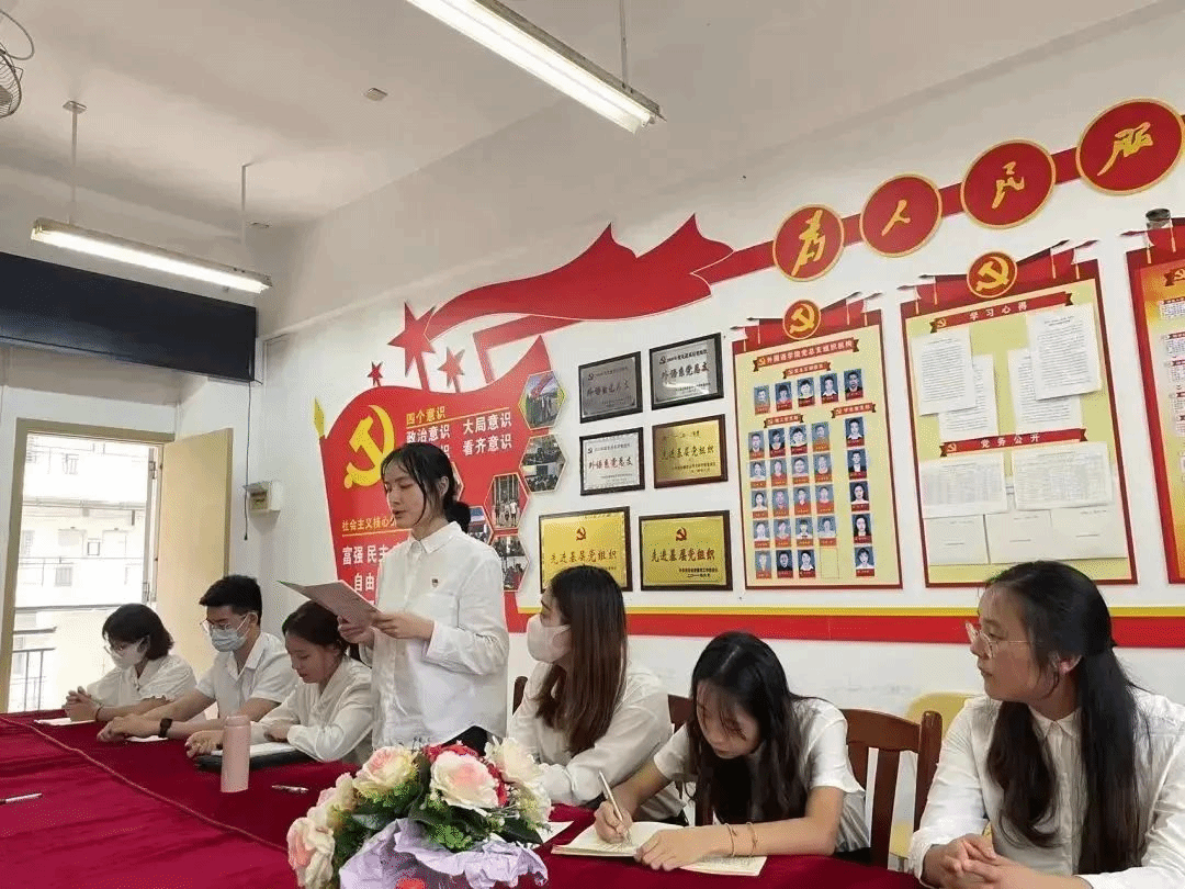 2022年11月4日,外国语学院党总支学生党支部在文B204党员活动室召开支部大会,本次大会主要议题为讨论预备党员韩雁丽等十一名同志的转正问题,鉴于疫情影响,本次会议采取线上线下相结合的方式。会议由党支部书记祁文婧同志主持,出席本次会议的还有党支部纪检委员孔燕同志、党支部宣传委员陈学同志、党支部支委委员陈芯妍同志和林紫荆同志、学生正式党员和预备党员。