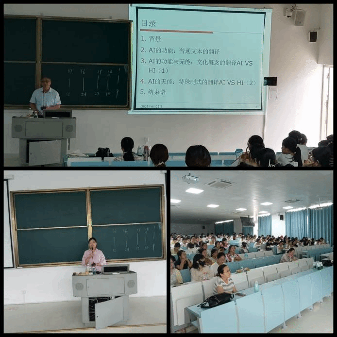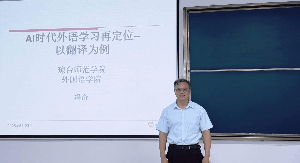 在人工智能(AI)技术席卷各行各业的当下,外语学习是否面临淘汰的质疑声不绝于耳。针对这一热议话题,2025年6月23日下午,外国语学院特聘院长冯奇教授以翻译为切入点,深入探讨AI时代外语学习的新定位,揭示AI在翻译领域的“功能与局限”,强调AI的工具价值与人类的人文价值的协同发展。该讲座由外国语学院副院长杨海燕主持,2023级英语专业全体学生、2023级各班班主任以及翻译课程相关教师参加。