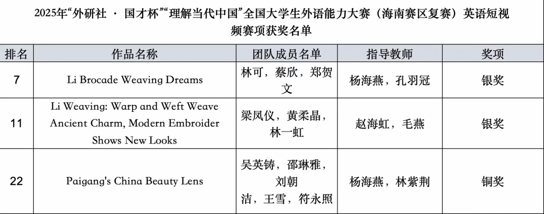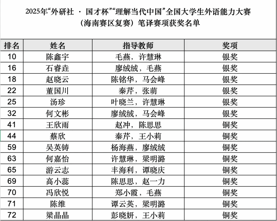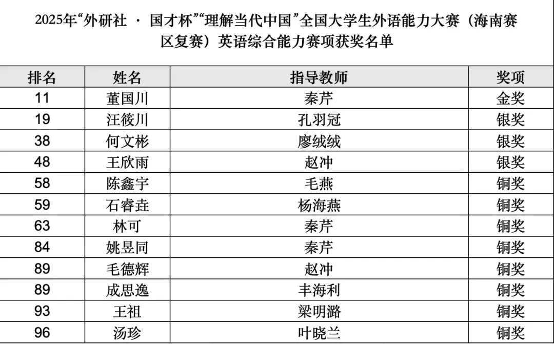 近日,我校学子参加第二十六届海南省高校大学生外语能力大赛暨2025年“外研社·国才杯”“理解当代中国”全国大学生外语能力大赛(海南赛区复赛)并荣获佳绩。“外研社·国才杯”大赛以“理解当代中国”为主题,引导广大青年学子立足外语专业优势,服务国家战略与海南自贸港发展需求,以语言为桥梁传递中国声音。
