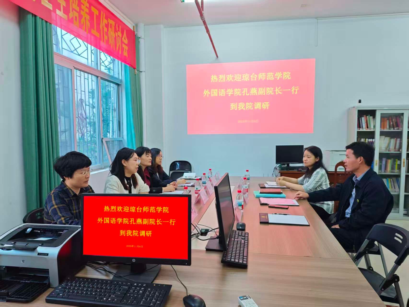 11月6日下午,外国语学院副院长孔燕带队,英语系主任丰海利、谭云英,公共外语部主任毛燕及教学秘书邓珍彬一行,赴海南师范大学外国语学院就英语专业师范认证工作开展专题交流学习。海南师范大学外国语学院副院长蔡激浪、英语系主任李敏、教学秘书王萍热情接待并参与交流。