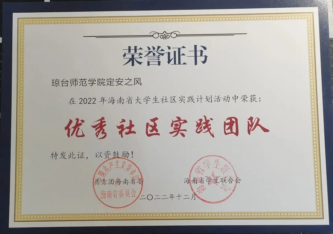 队长黄君妮在2022年海南省大中专学生志愿者暑期文化科技卫生“三下乡”社会实践活动中荣获“优秀学生”。