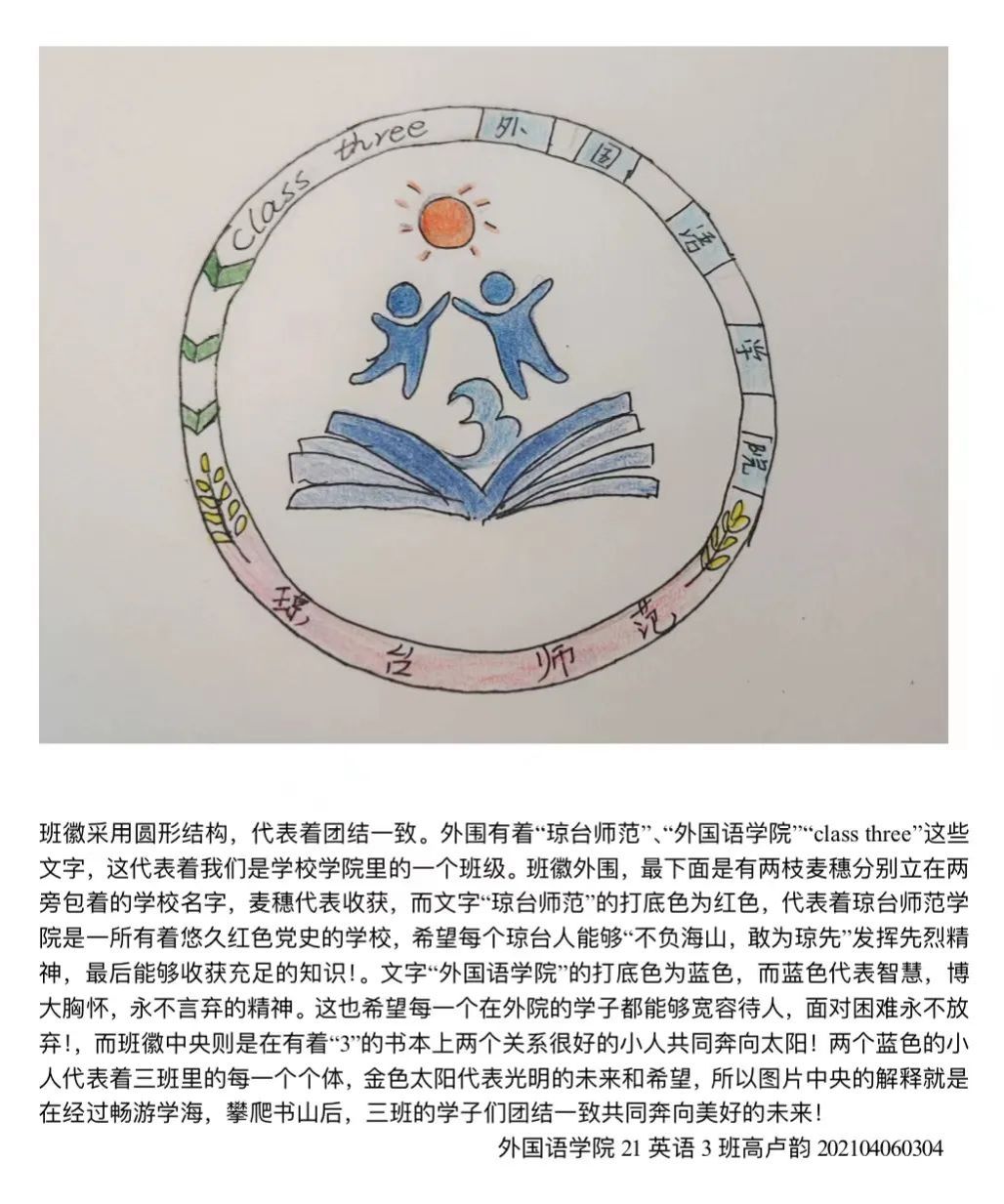 为丰富同学们的课余生活,促进同学们的创新能力,增强班级凝聚力,营造积极进取、温馨、和谐的班级,我院于3月31日举办了“多语种”班徽原创设计大赛。通过此活动,进一步帮助同学们加强对班级的归属感,拉进同班同学之间的关系。