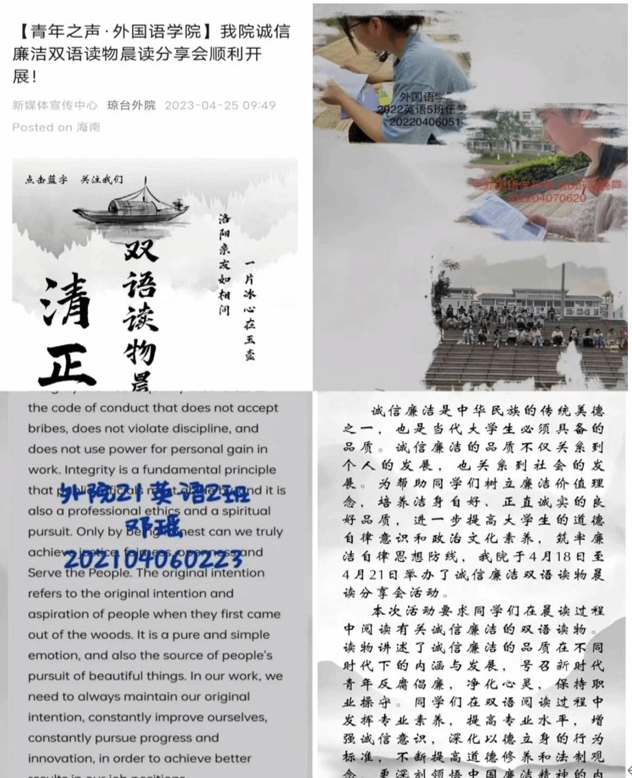 我院于2023年4月18日至21日早上7:25-7:50开展诚信廉洁双语读物晨读分享会,我院学生会学习创新部结合学院晨读特色,用英文在清晨朗读廉洁故事。各晨读班级踊跃参与此次活动,同学们在发放的双语读物中领悟廉洁内涵,增强诚信意识,不断修正自我。本次活动取得良好的成效和积极的教育意义,让学生深入廉洁文化。