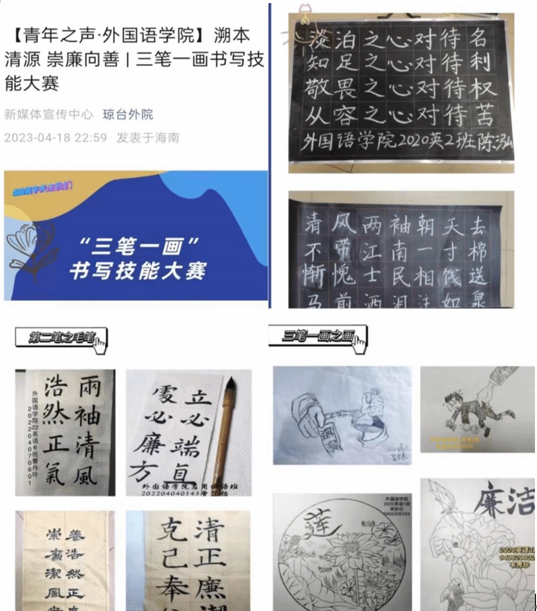 2023年4月14日,我院开展以廉洁为主题的三笔一画书写技能大赛。新颖的活动吸引二十余名同学报名参赛,并将以清正廉洁为主题的简笔画、书法等作品拍照上传至活动群。同学们在一笔一画比赛中加强了基本技能的锻炼,提高了综合素质,培养了专业特长。此次活动,最终共选出3名院级优秀代表参与校级决赛,并获得优异成绩。