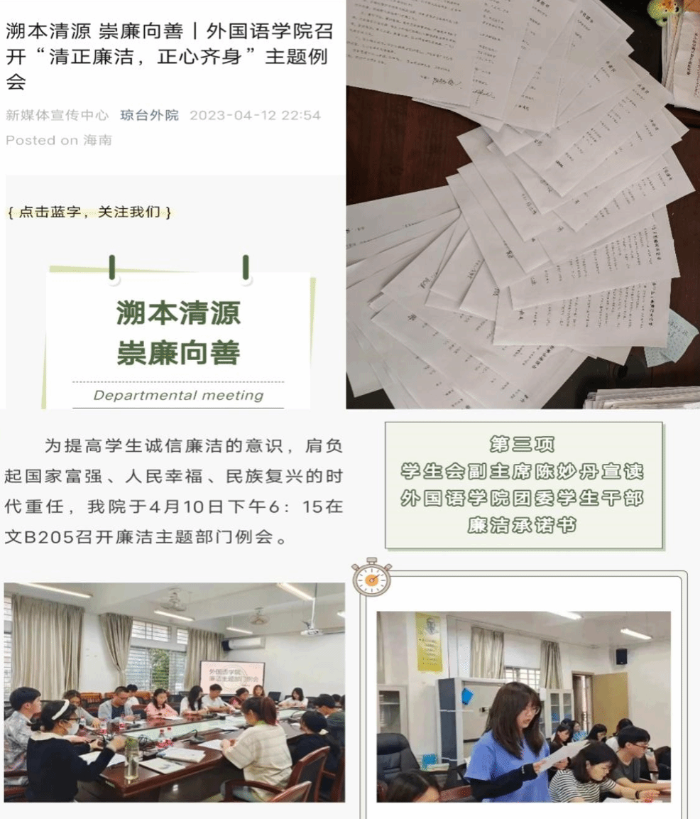 2023年4月10日,我院开展了“清正廉洁,正心齐身”主题例会,通过“廉洁自律、奉公守法”教育,塑造廉洁教育的良好氛围。会议上,外国语学院团委全体参会学生干部进行了宣誓,并逐一签署诚信廉洁承诺书。做到在律己的同时带领同学遵纪守法、廉洁自律,协助外院学生树立正确人生奋斗目标及健康的人生发展道路。