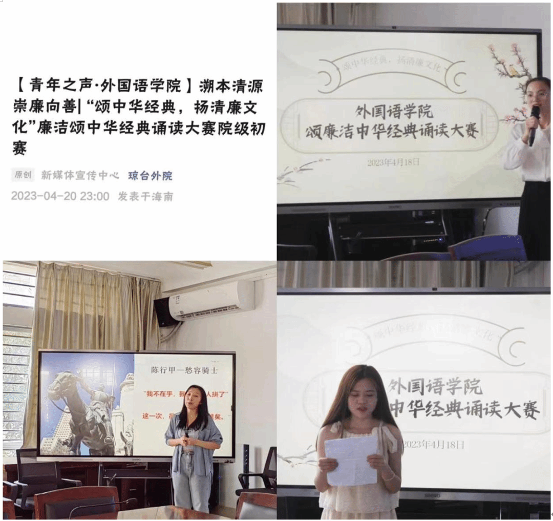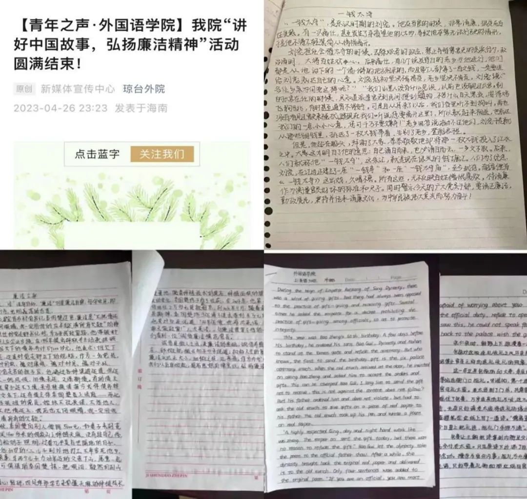 2023年4月20日,我院团委组织部开展了“讲好中国故事,弘扬廉洁精神”活动,此次活动通过让同学们翻译廉洁故事,提高其外语专业水平的同时也巩固了专业素养。有助于将廉洁文化内化于心、外化于行,形成新时代独具特色的廉洁精神。
