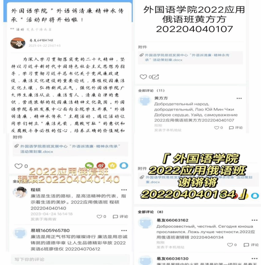 2023年4月22日,我院易班发展中心结合易班App,开展线上“外语诉清廉·精神永传承”活动。活动伊始,同学们积极参与,在活动链接下创作以“廉洁”为主题的诗歌,展现语言风采的魅力,用语言传承清廉精神,营造浓郁的校园廉洁精神文化氛围。