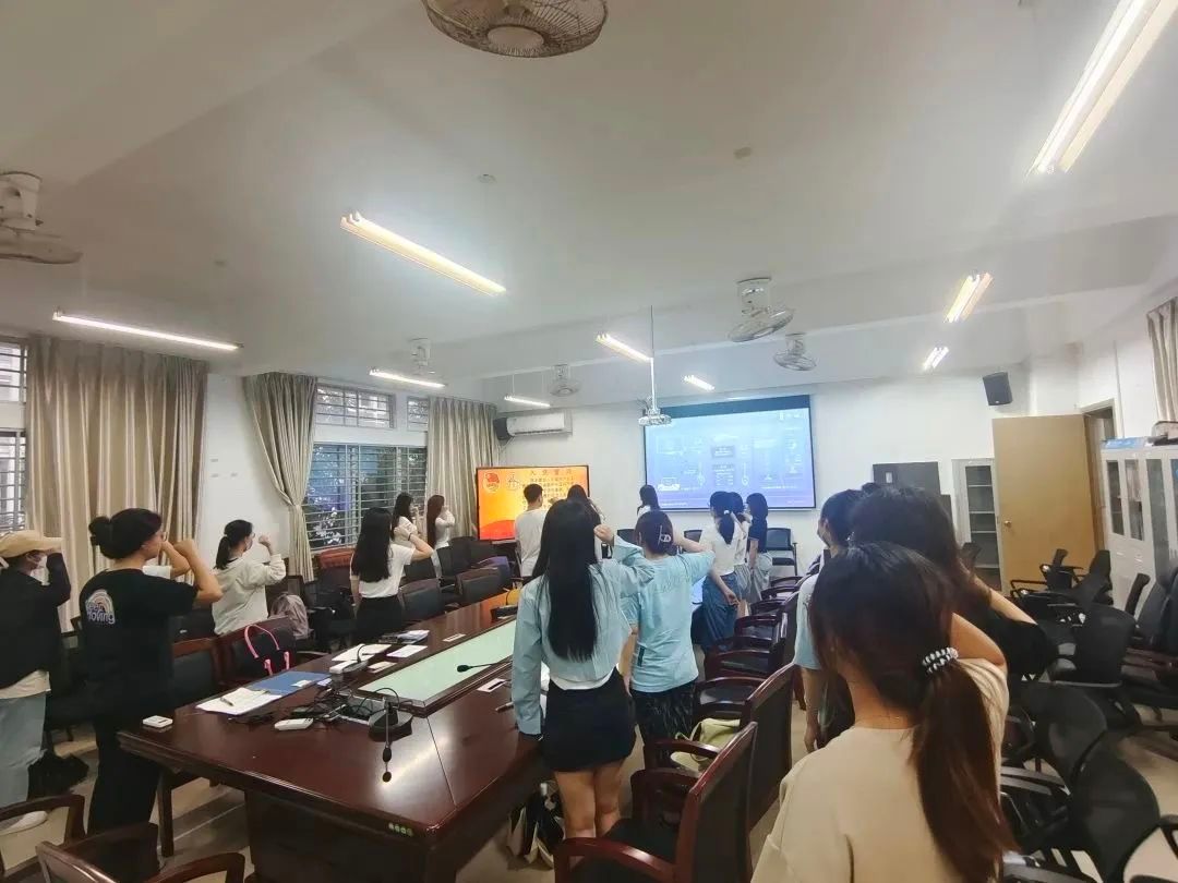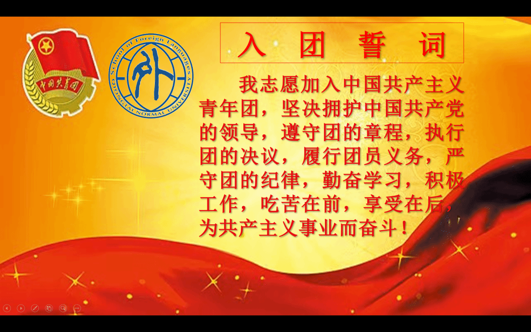 讲话结束后,外国语学院团委学生会副主席陈妙丹带领全体部长重温入团誓词,进行宣誓,以此勉励在座学子们不忘初心,方得始终。