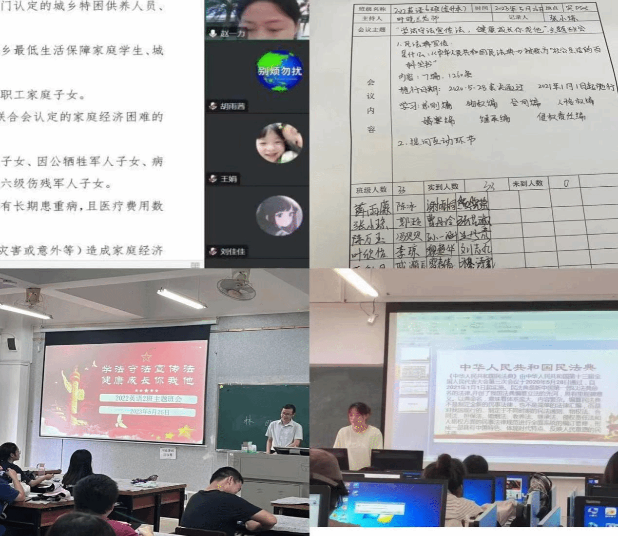 2023年5月26日,外国语学院各班通过线上线下相结合的方式,开展了“学法守法宣传法,健康成长你我他”主题班会,班主任向同学们讲述了民法典的作用和意义、普及法律知识,以及向大家强调了民法典的重要性,嘱咐大家认真学习,争做遵纪守法的新时代青年!