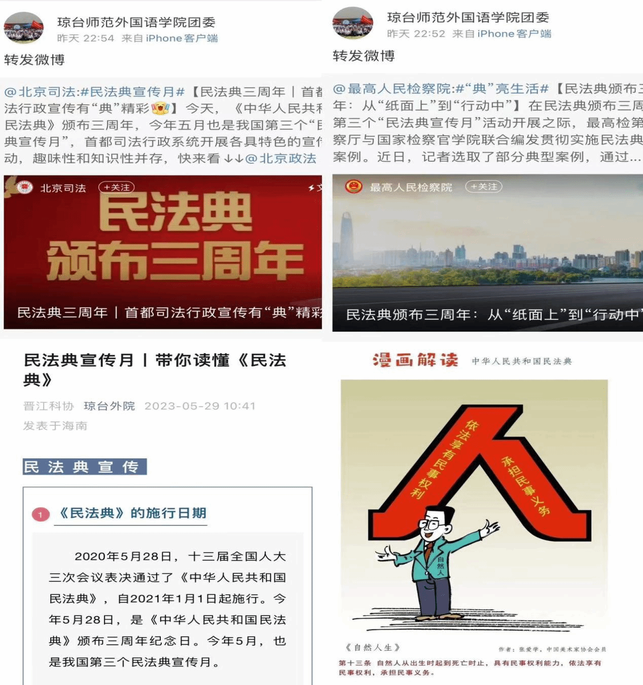 2023年5月28日,外国语学院转发了北京司法和最高人民检察院讲述民法典的相关微博,转载了相关公众号民法典宣传月推文。通过此种形式进一步加深同学们对民法典的认识,让民法典更加深入人心,并且教育引导学生强化法治意识,提高法治素养。