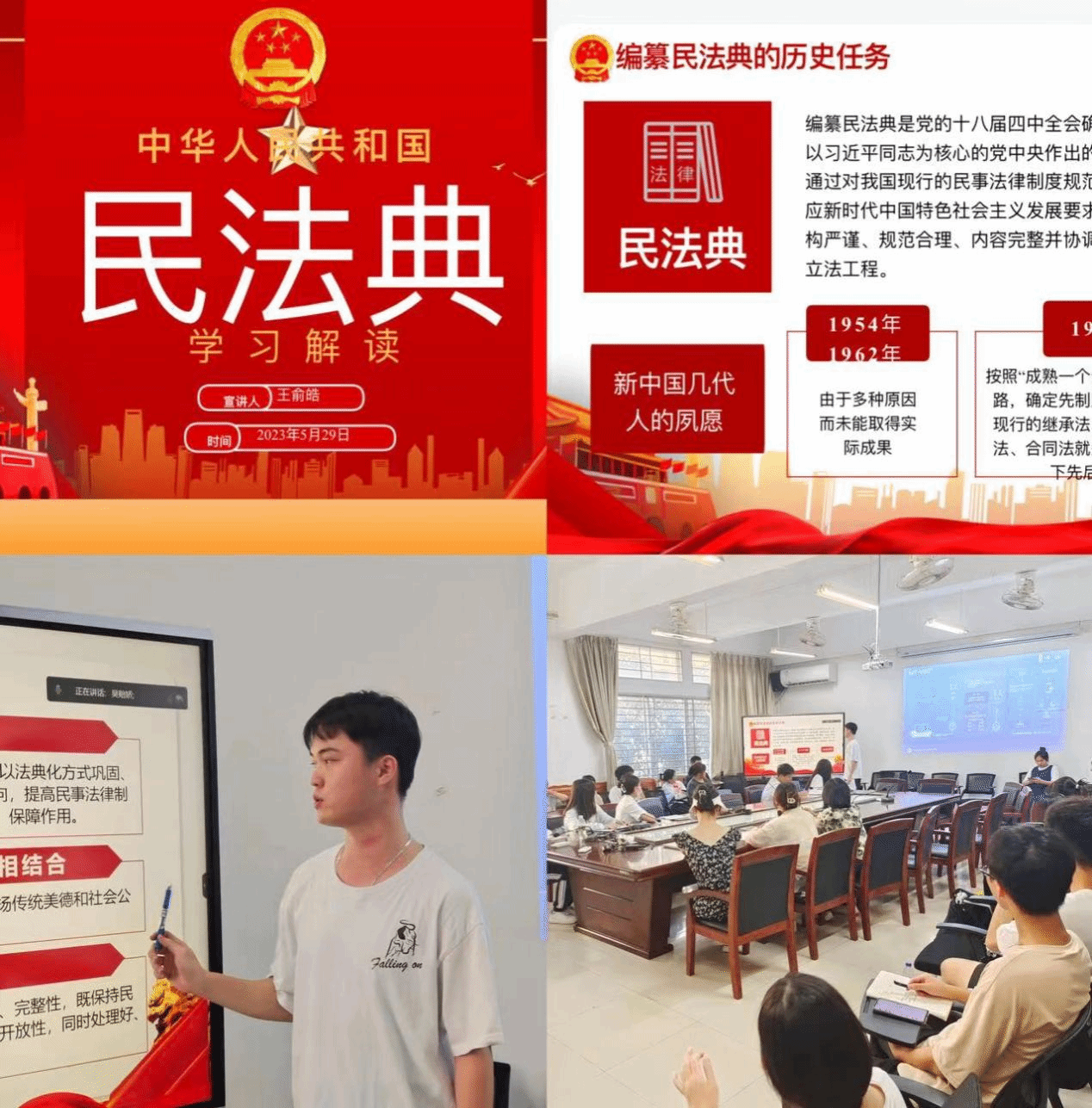 2023年5月29日,外国语学院开展了一场民法典学习宣传公开课,由外国语学院团委副书记王俞皓主讲,向大家讲解了民法典相关的历史任务、意义和基本原则,以及主要内容。全体参会学生干部要起到带头作用,以点带面带领身边同学一起学习。此次公开课不仅发挥了课堂教学主渠道作用,还鼓励外国语学院学生积极学习法律知识,真正做到知法、懂法、守法。