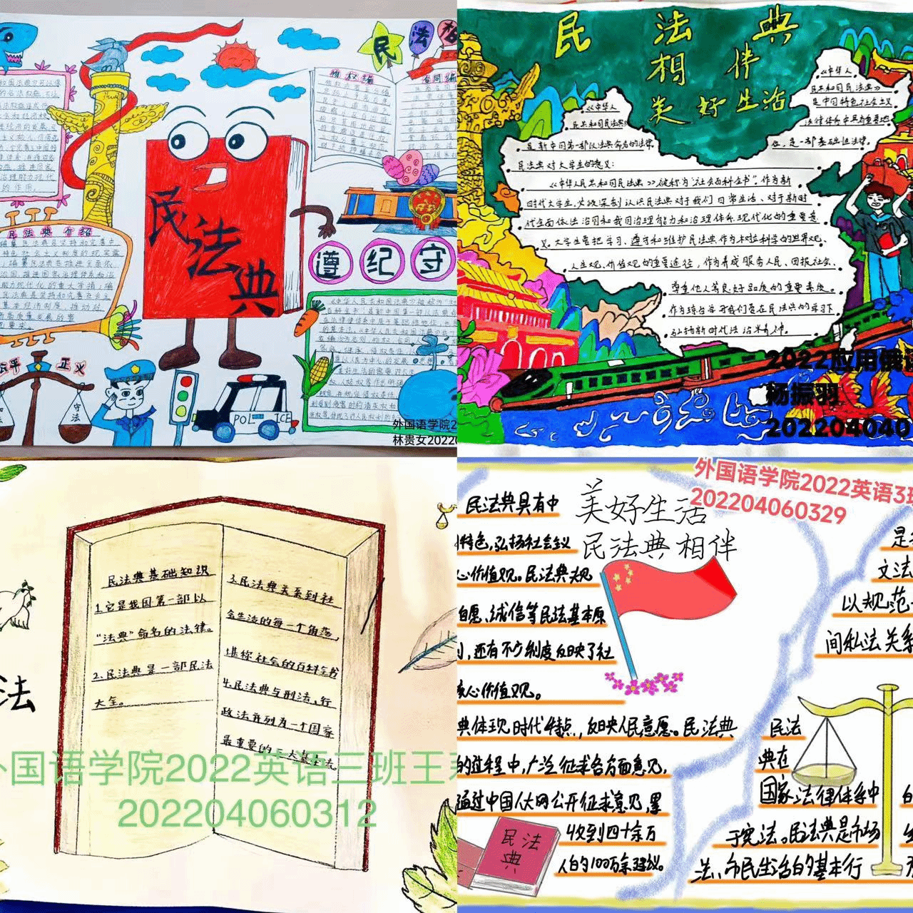 2023年5月26日,外国语学院团委办公室组织开展了“美好生活·民法典相伴”主题黑板报(手抄报)创作大赛活动,二十余名同学积极参与,并将以民法典为主题的黑板报或手抄报作品向大家分享展示。同学们在此次活动中更加深入地学习、了解到民法典的意义,有助于实现社会主义核心价值观,增强大学生的法治意识。