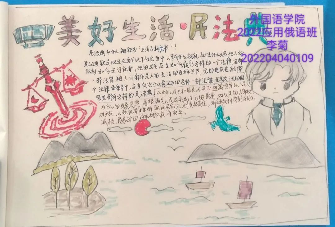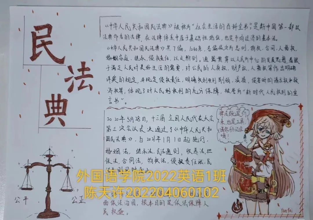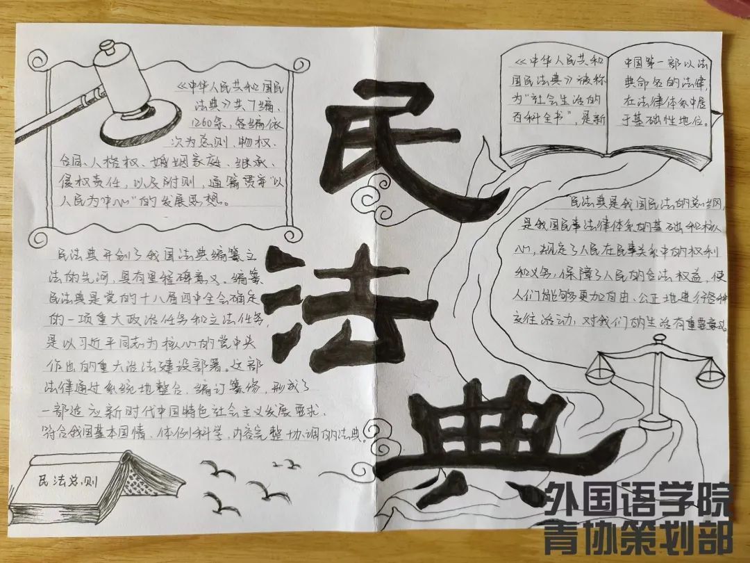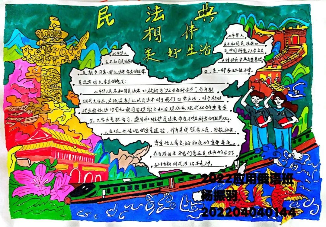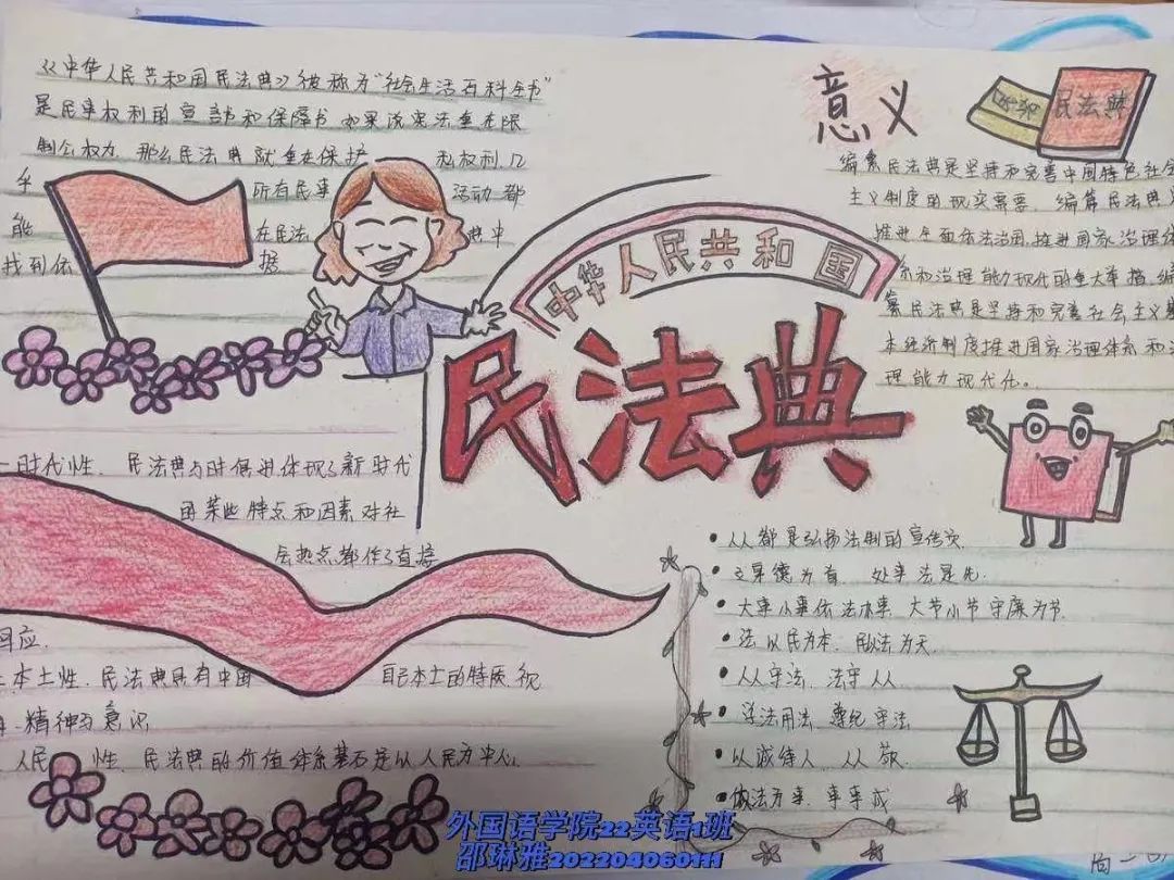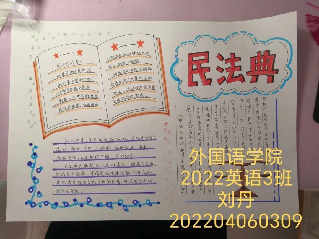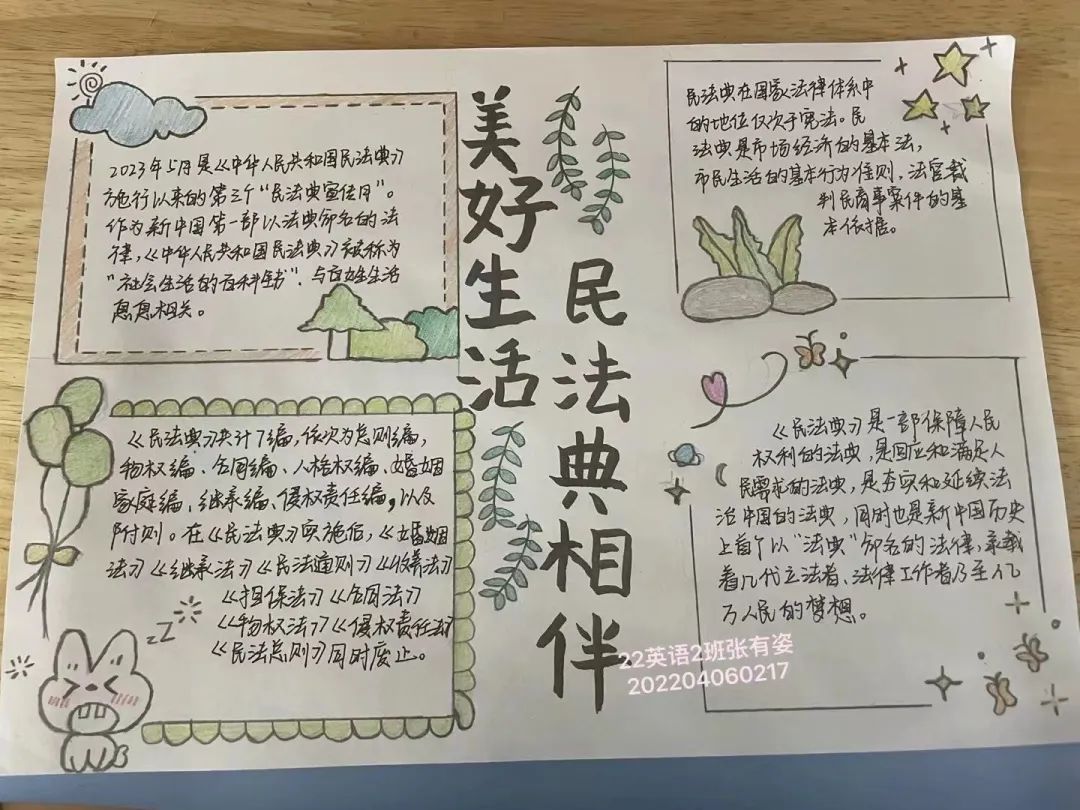 为全面贯彻落实党的二十大精神,推动民法典学习宣传往深里走、往实里去、往心里走。外国语学院开展了“美好生活,民法典相伴”为主题的黑板报(手抄报)活动,此次活动旨在为学生们提供了展示自我、了解法律知识的机会。