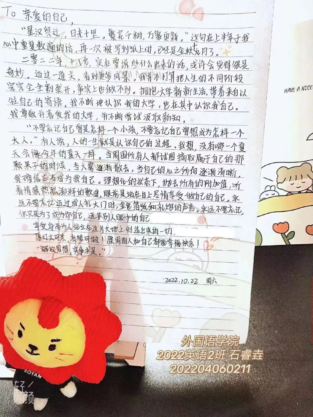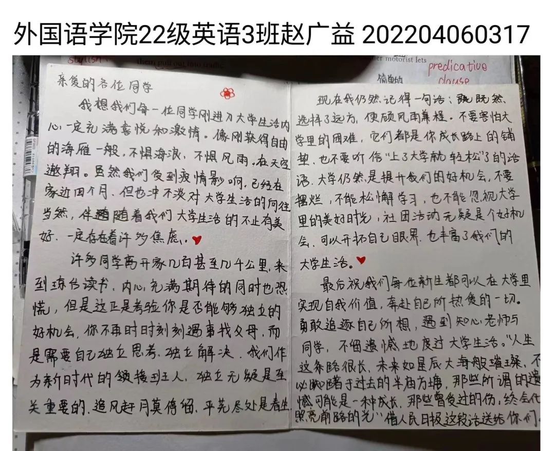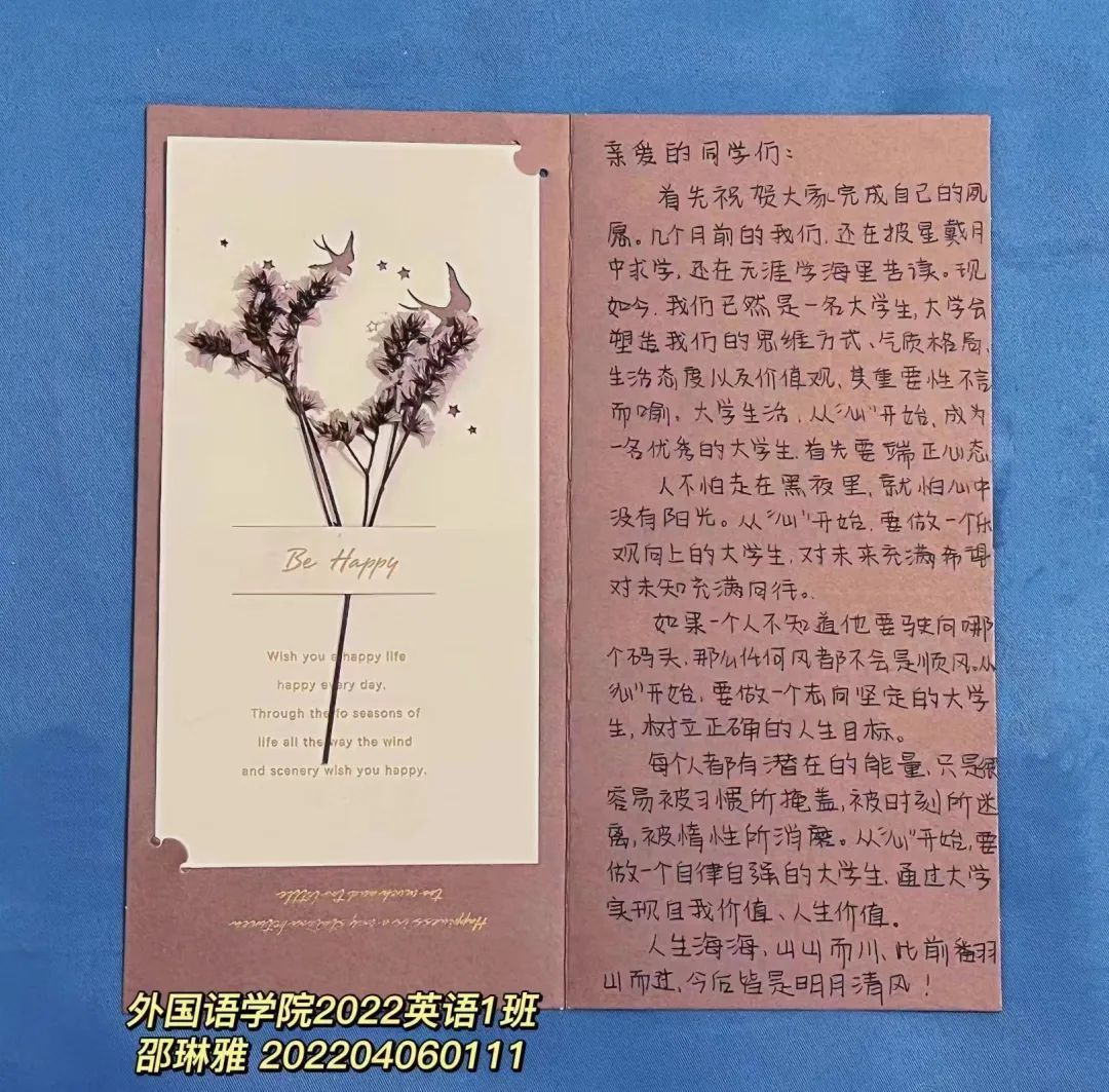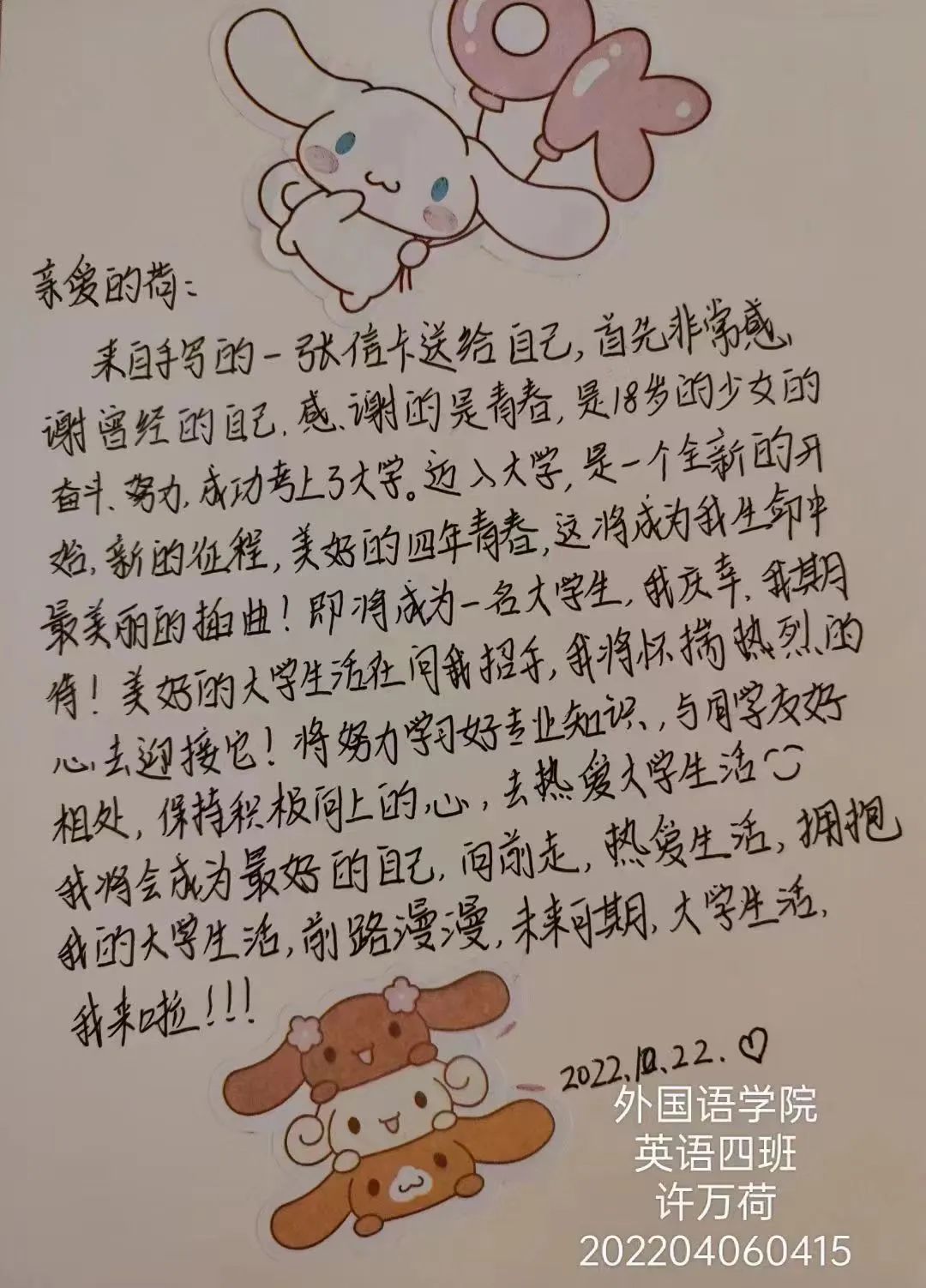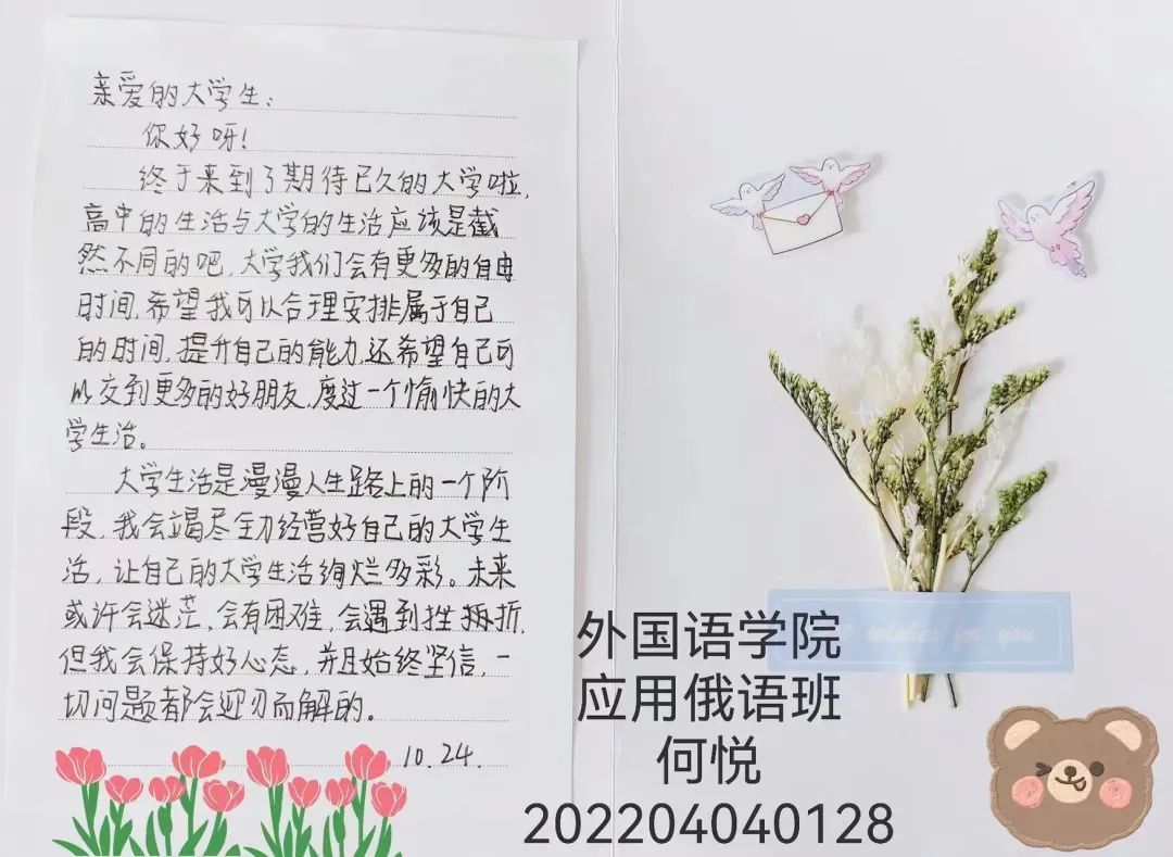为此,我院举办了此次题为“大学生活,从‘心’开始”的交流活动,旨在帮助新生提高心理素质,增强心理自助能力与助人能力,顺利完成中学到大学阶段过渡。该活动受到了来自新生们的热烈欢迎并且积极参与,封封来信氤氲出由内生发的真挚情感,娓娓道来欣喜与担忧交织的复杂情绪。一封封书信,真挚笔触令人动容,下面是本次活动中的部分优秀作品展示。