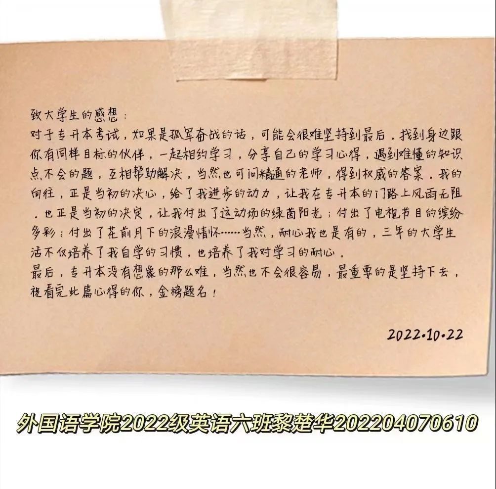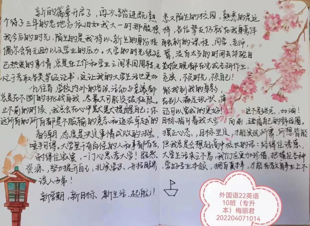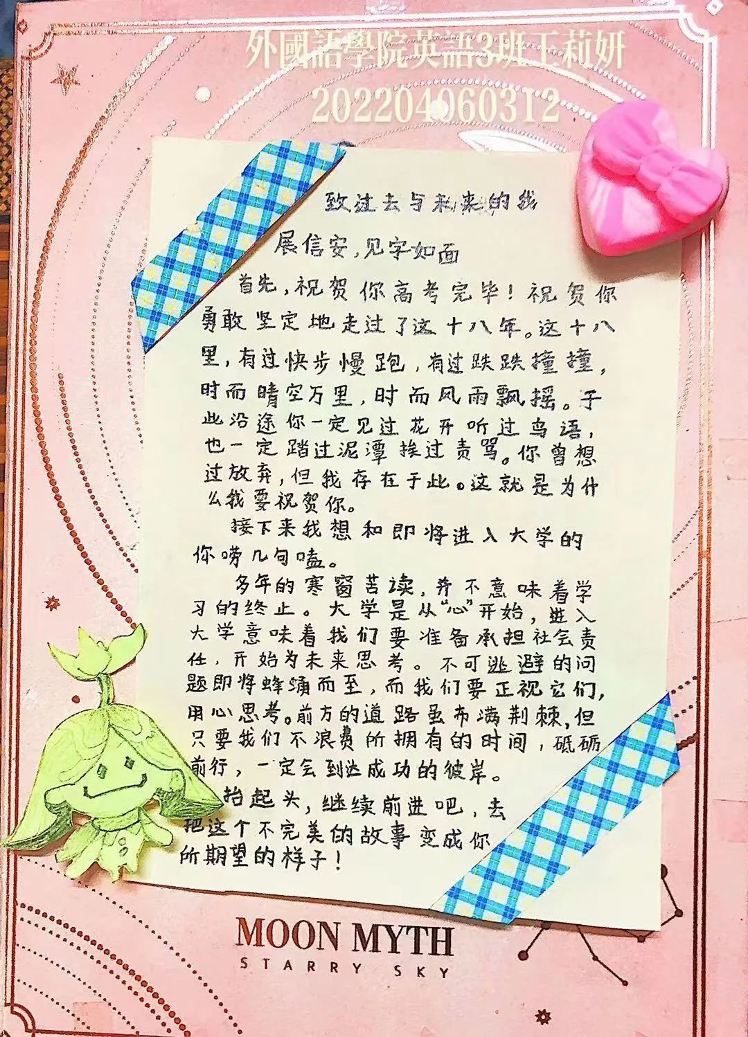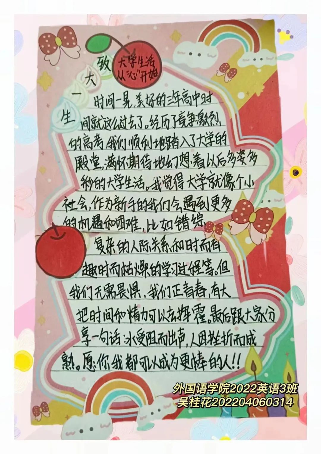 为此,我院举办了此次题为“大学生活,从‘心’开始”的交流活动,旨在帮助新生提高心理素质,增强心理自助能力与助人能力,顺利完成中学到大学阶段过渡。该活动受到了来自新生们的热烈欢迎并且积极参与,封封来信氤氲出由内生发的真挚情感,娓娓道来欣喜与担忧交织的复杂情绪。一封封书信,真挚笔触令人动容,下面是本次活动中的部分优秀作品展示。