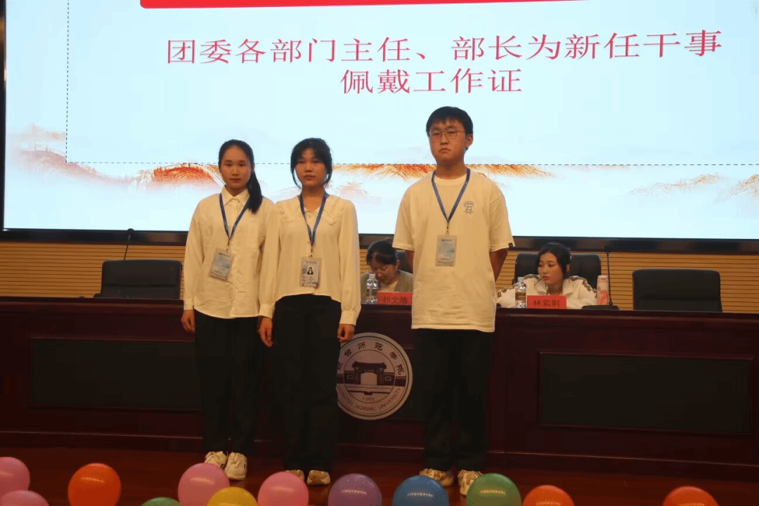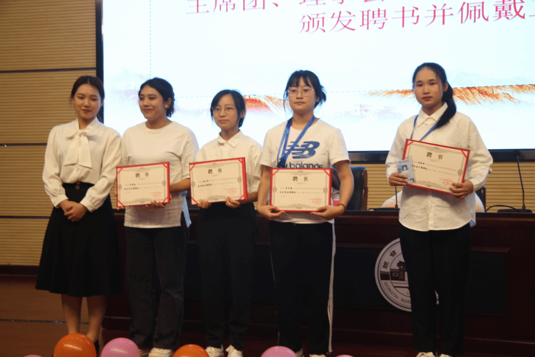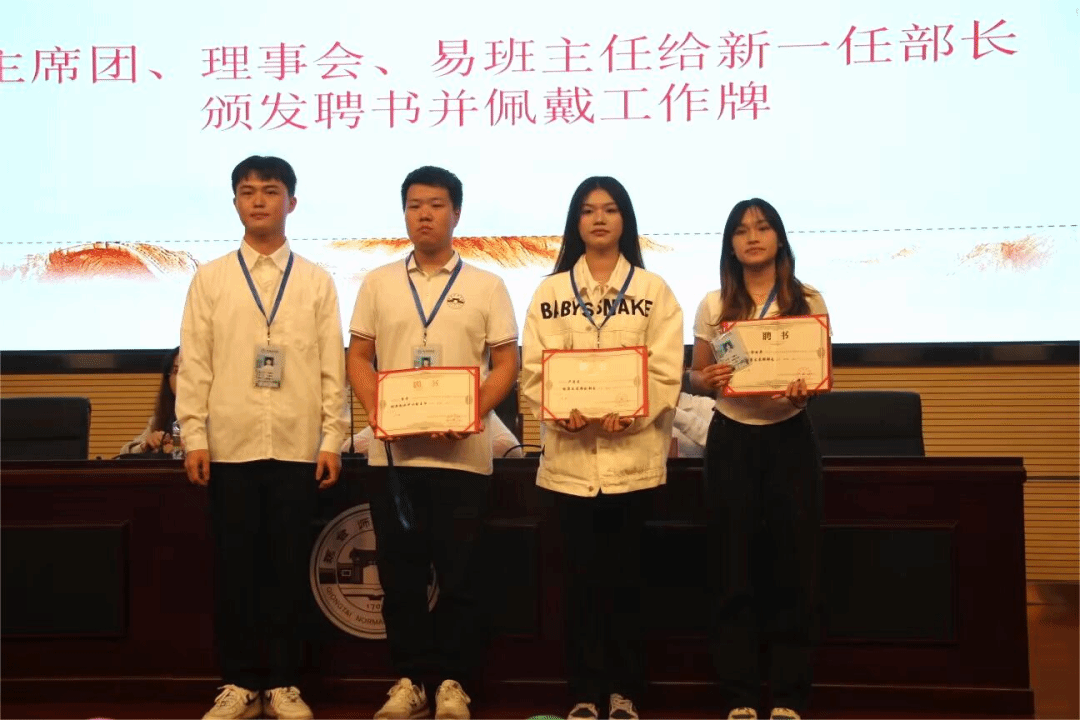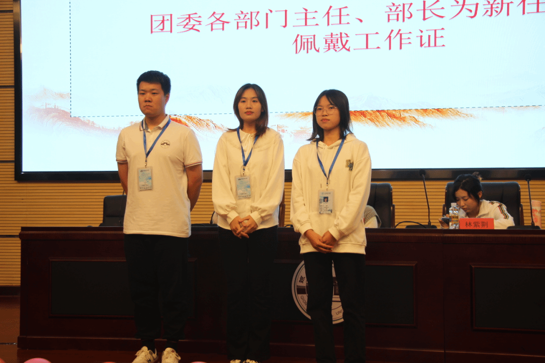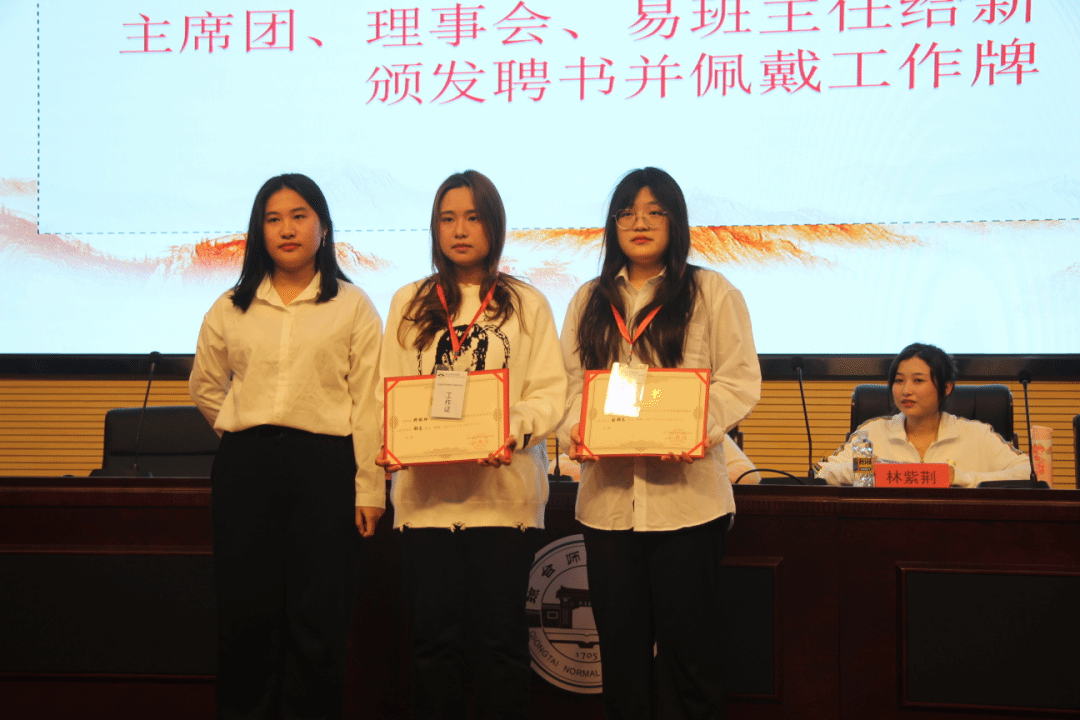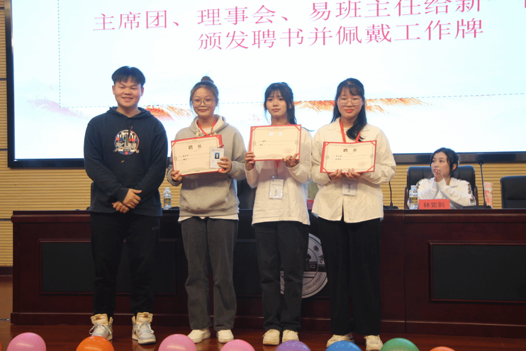 团委书记林紫荆老师、团委副书记陈芯妍老师为新一届主席团、理事会和易班主任团颁发聘书并佩戴工作牌。