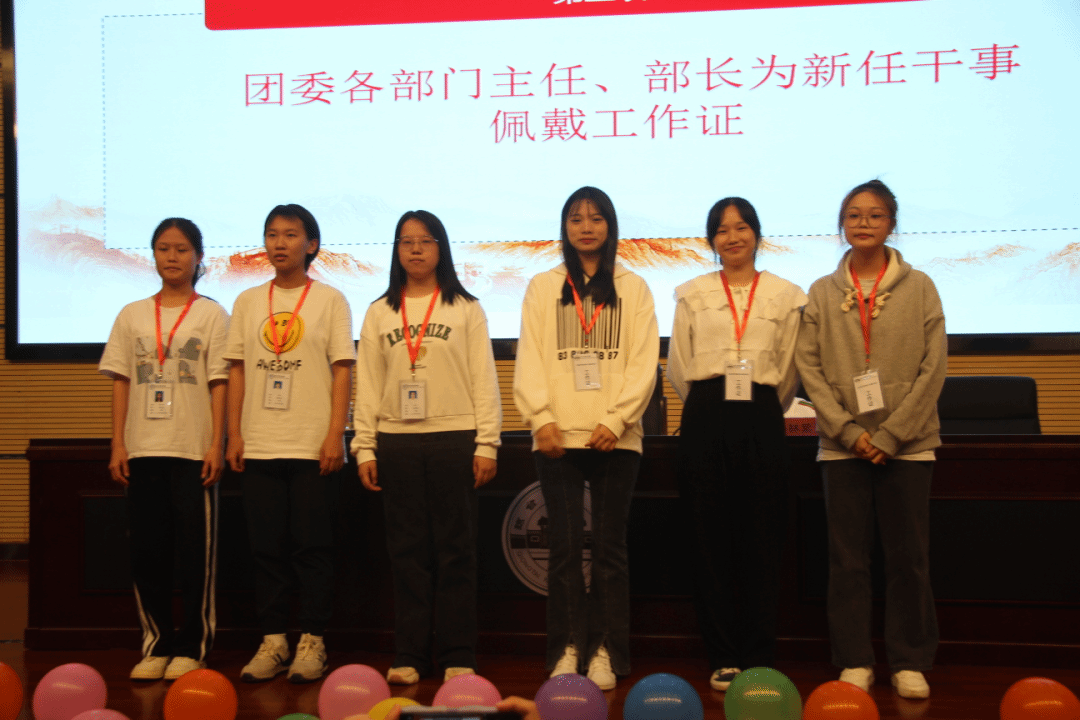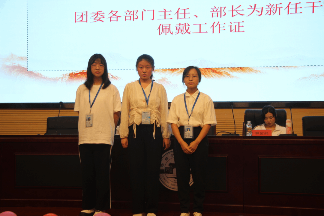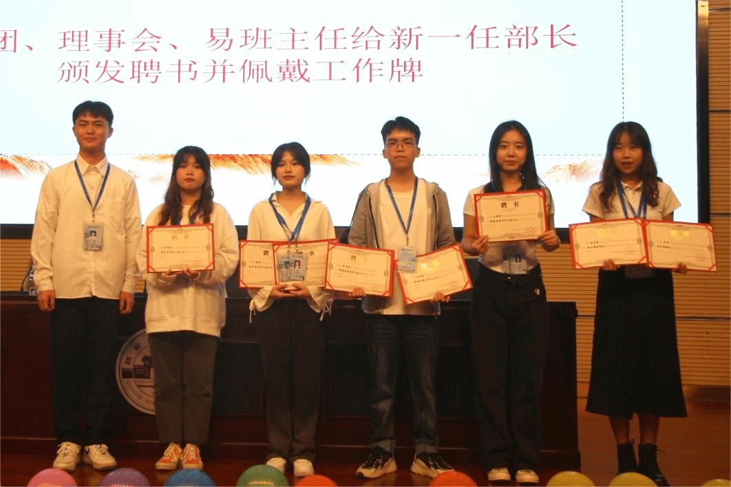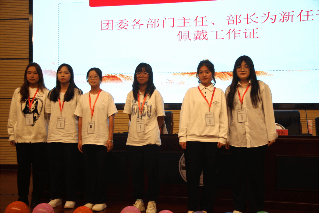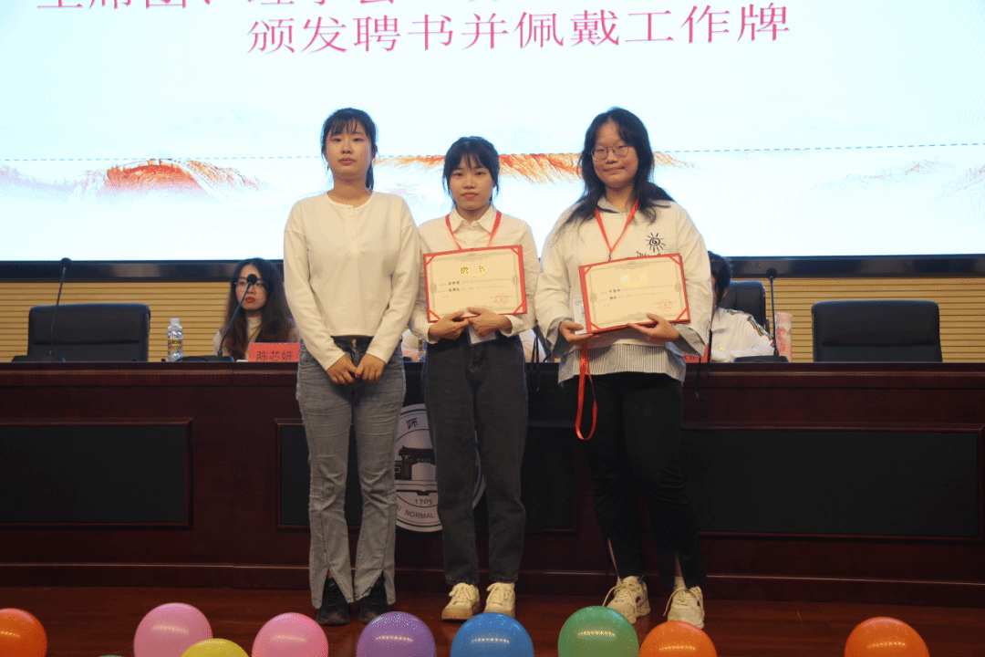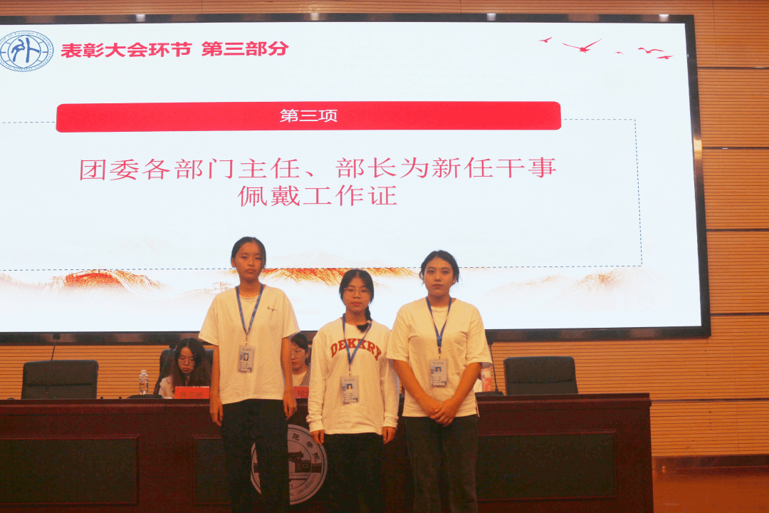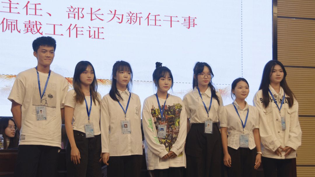 团委书记林紫荆老师、团委副书记陈芯妍老师为新一届主席团、理事会和易班主任团颁发聘书并佩戴工作牌。