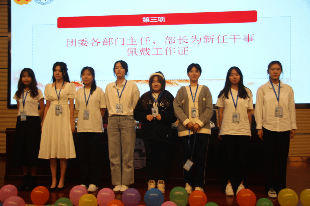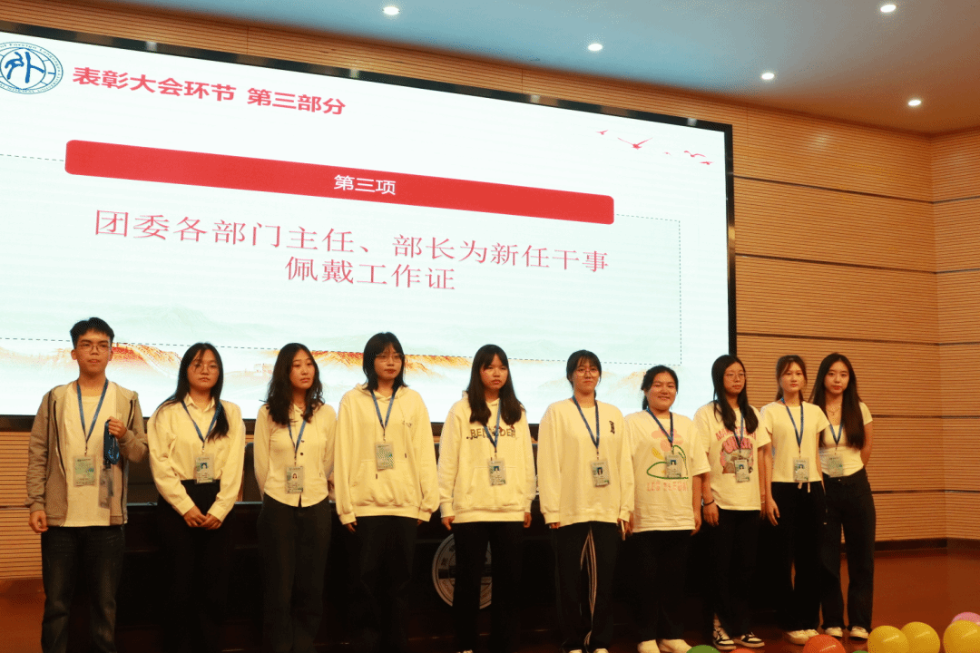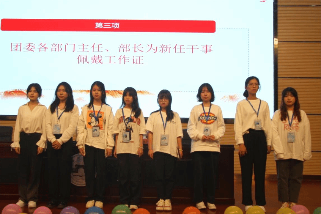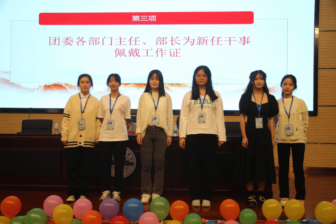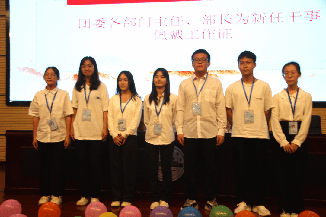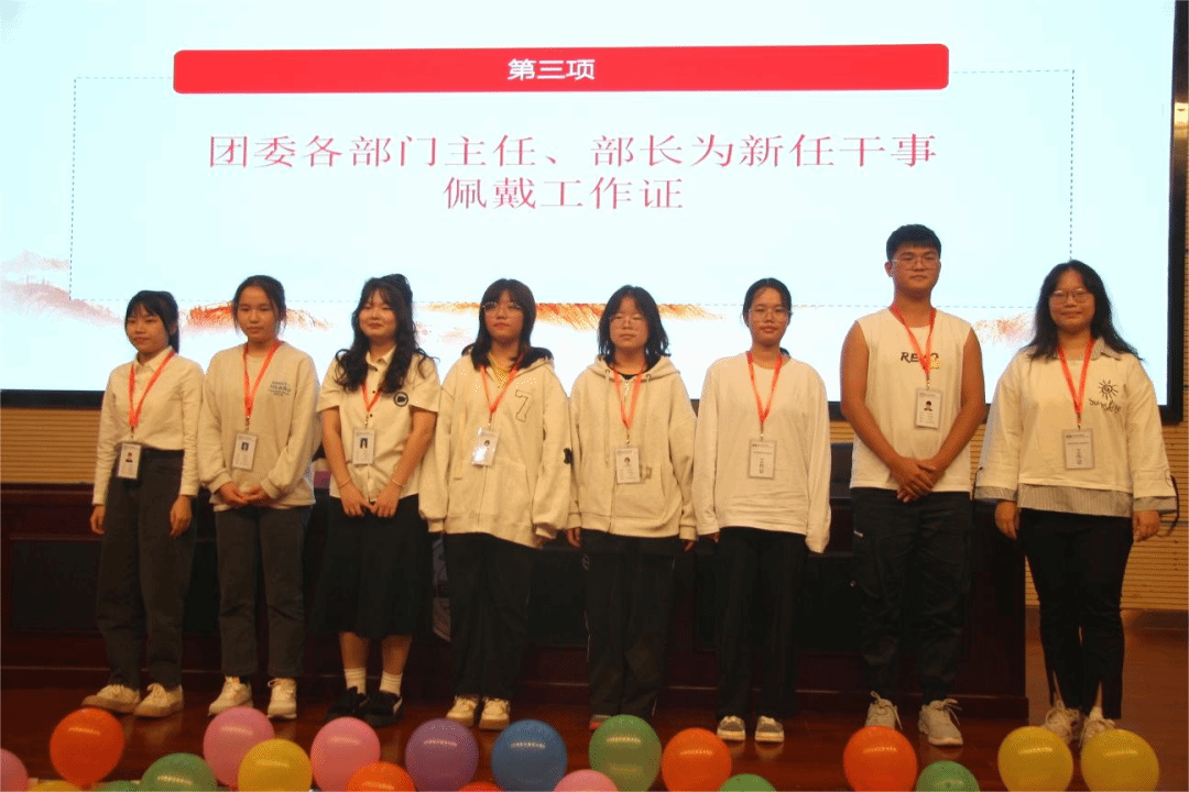 团委书记林紫荆老师、团委副书记陈芯妍老师为新一届主席团、理事会和易班主任团颁发聘书并佩戴工作牌。
