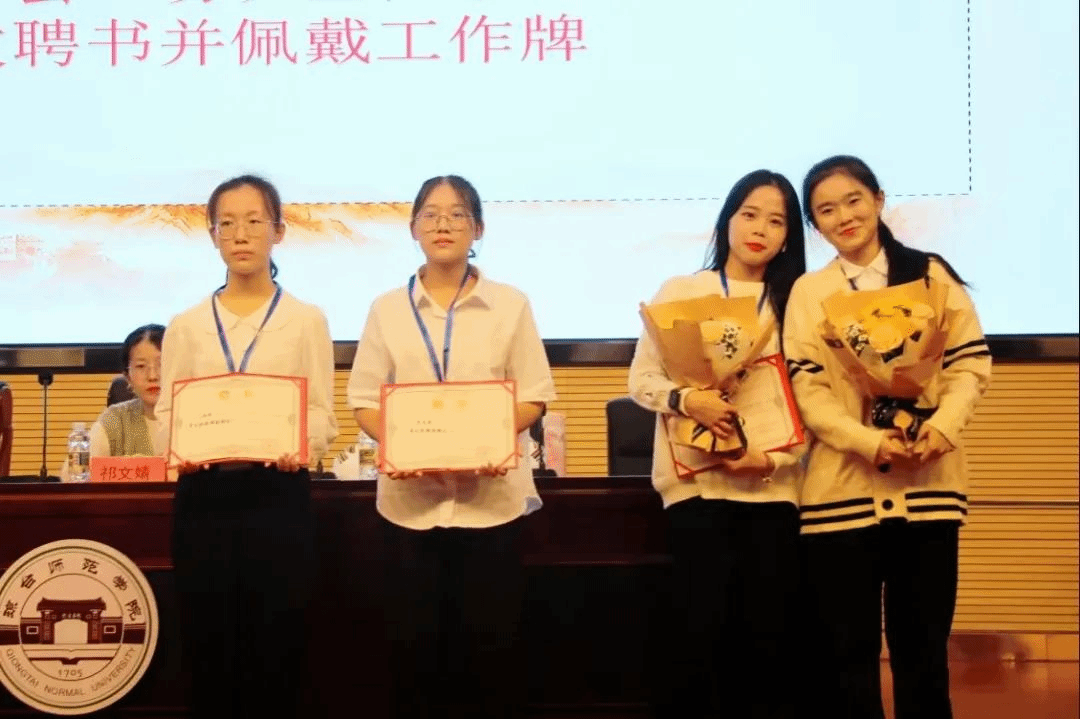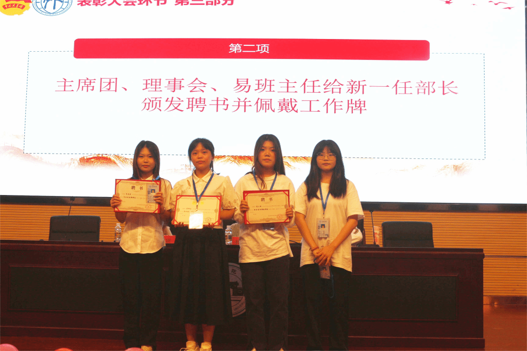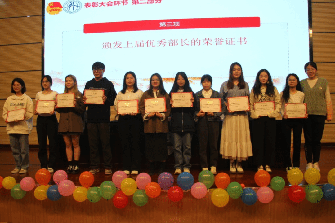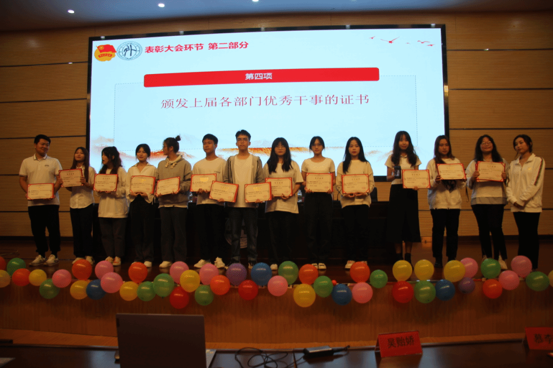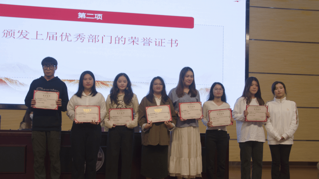 辅导员祁文婧老师为上一届优秀部长颁发荣誉证书。